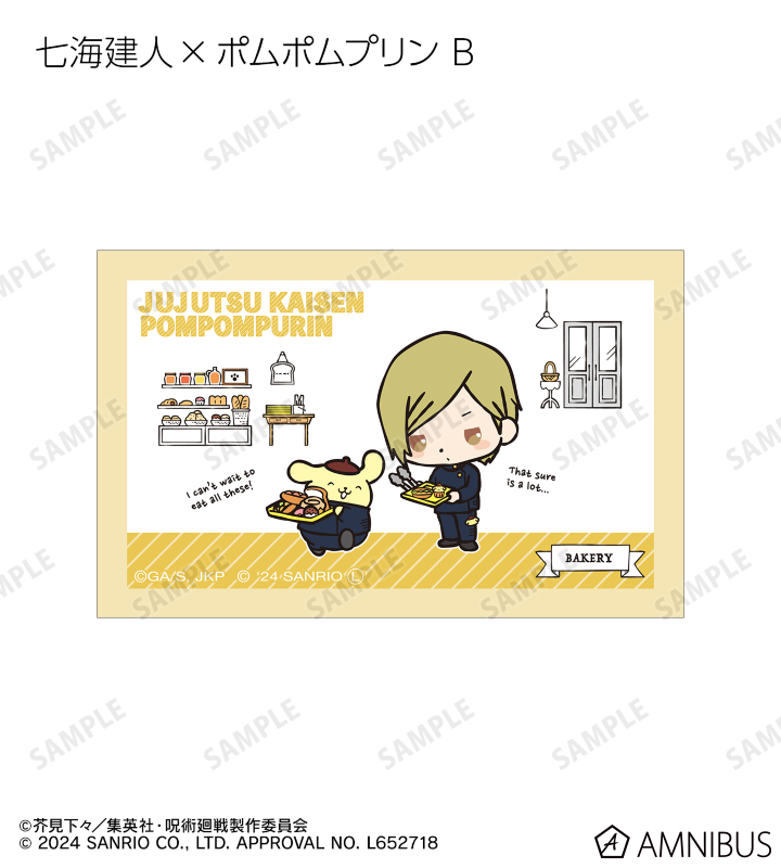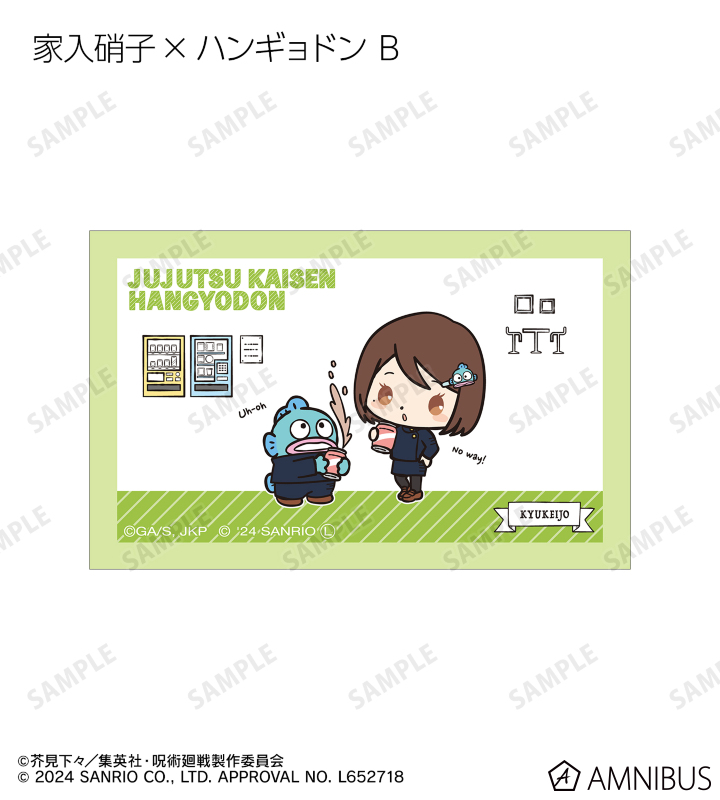 五条 悟×シナモロール、夏油 傑×ルロロマニック、家入硝子×ハンギョドン、七海建人×ポムポムプリン、灰原 雄×コロコロクリリン 、天内理子×こぎみゅん、伏黒甚爾×バッドばつ丸のイラストをイラストカードに仕上げました。