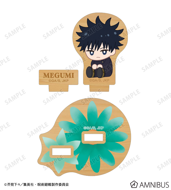 伏黒 恵のイラストをボタニカルデザインに落とし込んで繊細なタッチで新たに描き起こし、パーツ付きのウッドスタンドに仕上げました。