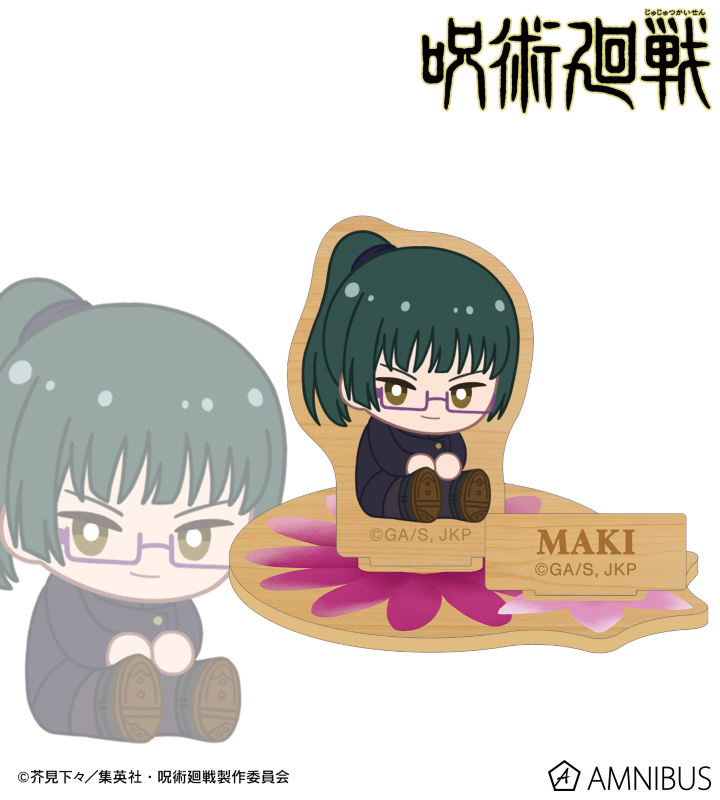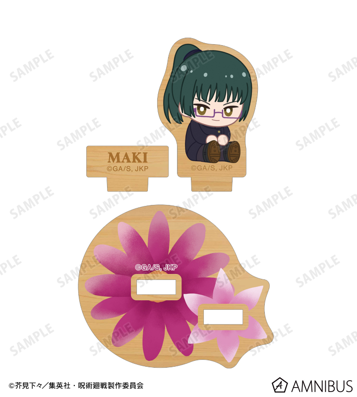 禪院真希のイラストをボタニカルデザインに落とし込んで繊細なタッチで新たに描き起こし、パーツ付きのウッドスタンドに仕上げました。