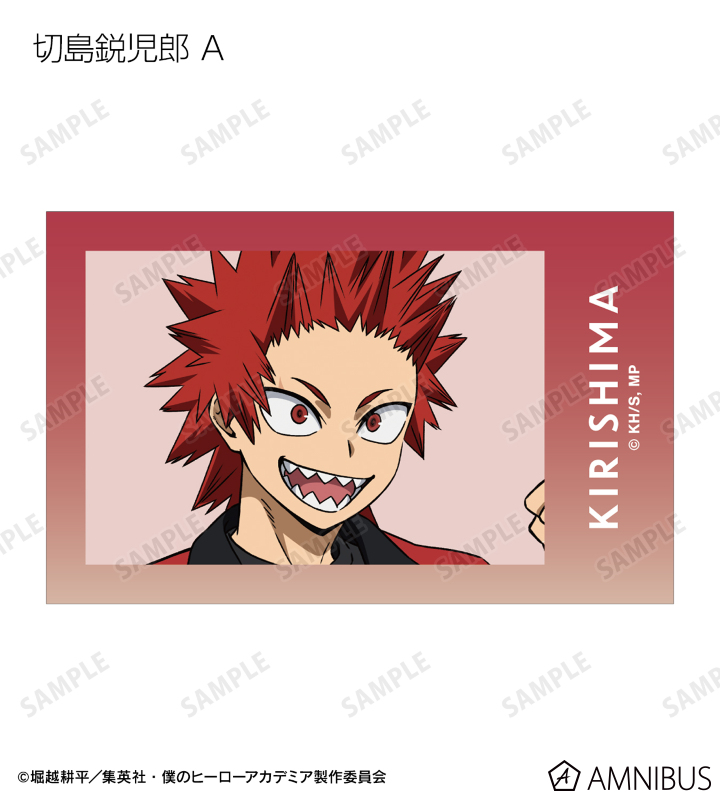 緑谷出久、爆豪勝己、轟焦凍、切島鋭児郎、上鳴電気、瀬呂範太の描き下ろしビジュアル、キャラクターの名前をイラストカードに仕上げました。