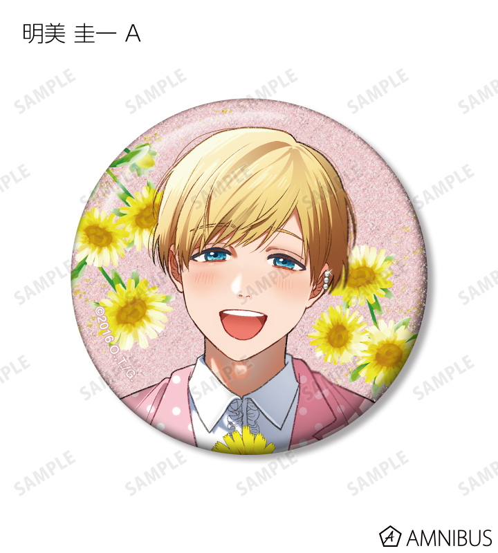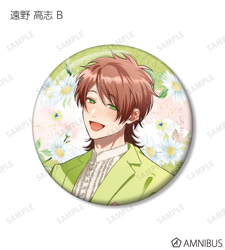 おげれつたなか先生描き下ろしイラストの遠野 高志、加島 優、矢口 恭介、百合 絢斗、田村 唯、鹿谷 樹、明美 圭一、糸目 幸士郎、藤咲 透をグリッター加工を施した缶バッジに仕上げました。