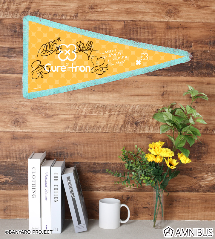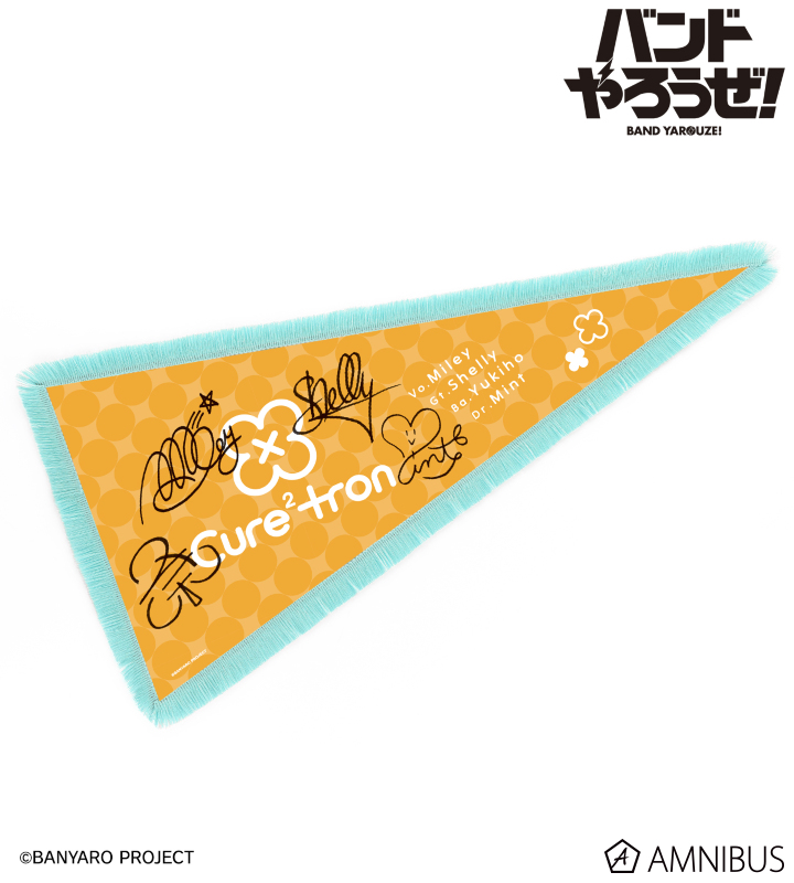 マイリー、シェリー、ユキホ、ミントのサイン、キャラクターの名前、Cure²tronのロゴをBIGペナントに仕上げました。