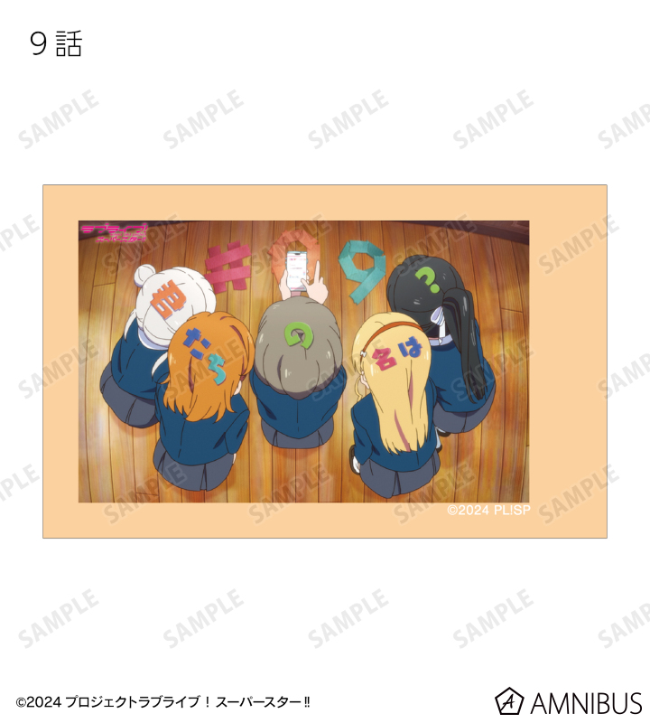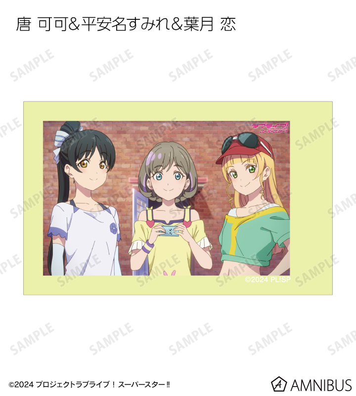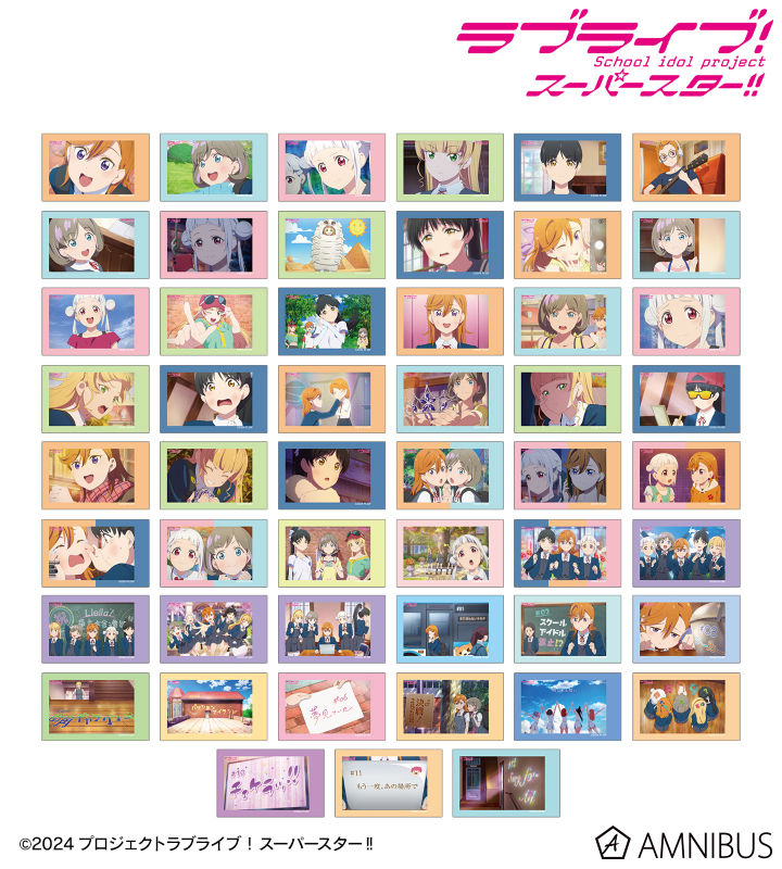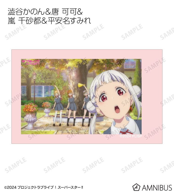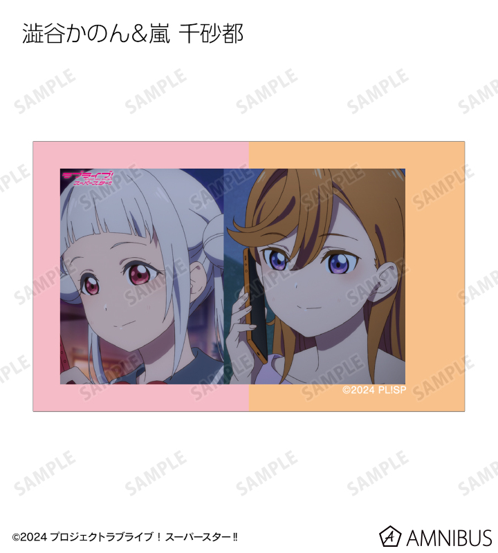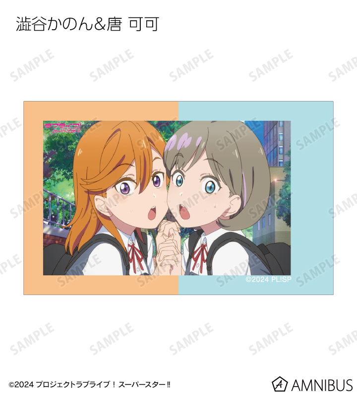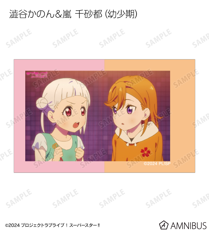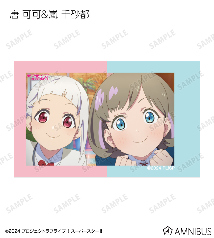 澁谷かのん、唐 可可、嵐 千砂都、平安名すみれ、葉月 恋のイラスト、1話、2話、3話、4話、5話、6話、7話、8話、9話、10話、11話、12話の印象的なシーンをインスタントカメラ風のイラストカードに仕上げました。