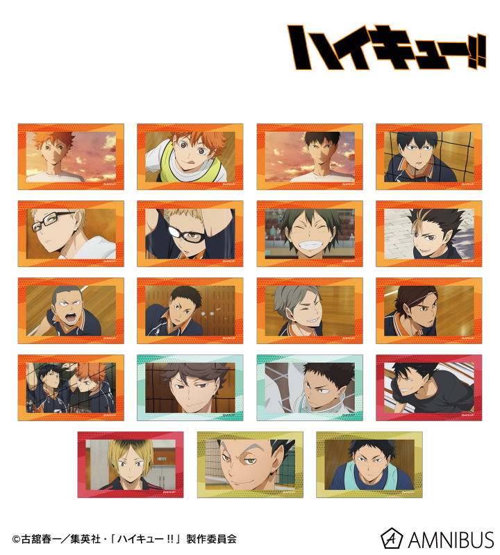 日向翔陽、影山飛雄、月島 蛍、山口 忠、西谷 夕、田中龍之介、澤村大地、菅原孝支、東峰 旭、及川 徹、岩泉 一、黒尾鉄朗、孤爪研磨、木兎光太郎、赤葦京治の印象的なシーンをイラストカードに仕上げました。