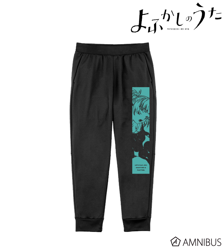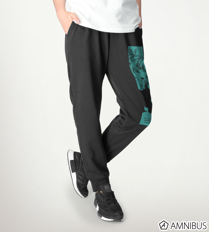 七草ナズナのイラスト、ナズナのセリフ「遊ぼうぜ少年 夜は遊ぶもんだ。」の英文をスウェットパンツに仕上げました。