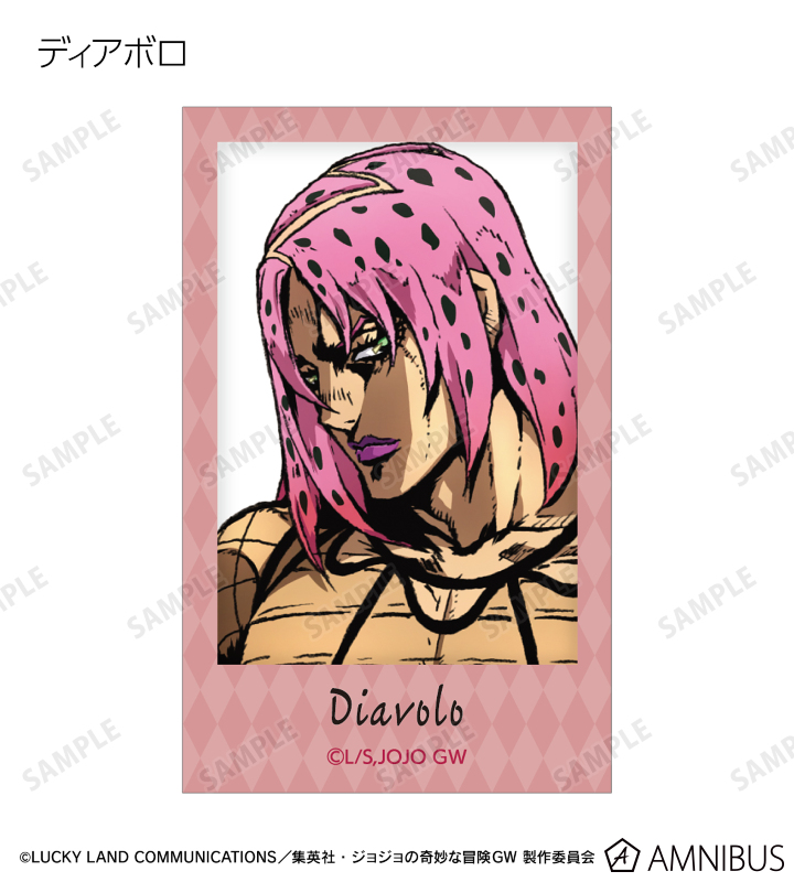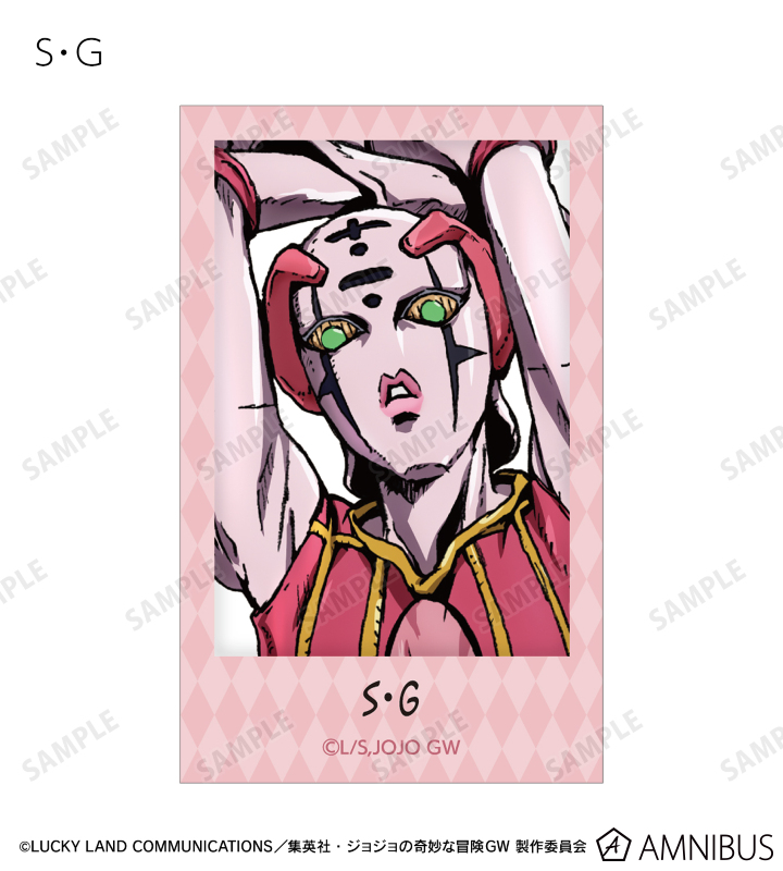 ジョルノ・ジョバァーナ、G・E、ブローノ・ブチャラティ、S・F、グイード・ミスタ、S・P、ナランチャ・ギルガ、As、レオーネ・アバッキオ、M・B、パンナコッタ・フーゴ、P・H、トリッシュ・ウナ、S・G、ディアボロ、K・Cのイラスト、キャラクターの名前をインスタントカメラ風のイラストカードに仕上げました。