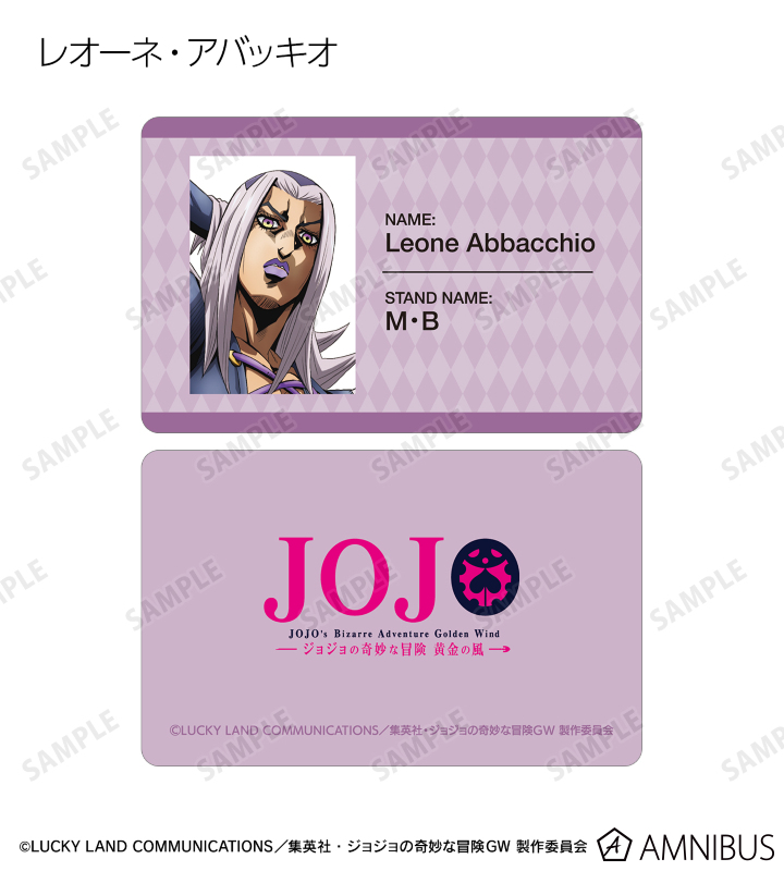 ジョルノ・ジョバァーナ、ブローノ・ブチャラティ、グイード・ミスタ、ナランチャ・ギルガ、レオーネ・アバッキオ、パンナコッタ・フーゴ、トリッシュ・ウナ、ディアボロのイラスト、キャラクターの名前、スタンド名をプラスチックカードに仕上げました。