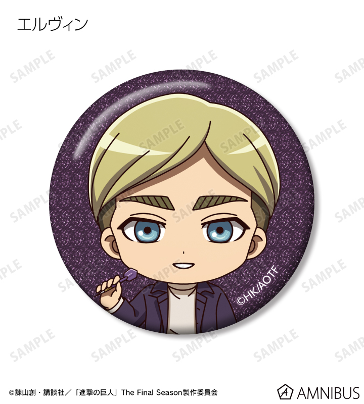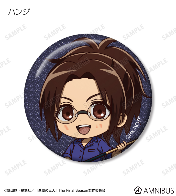 エレン、ミカサ、アルミン、ジャン、サシャ、エルヴィン、ハンジ、リヴァイのちびキャライラストをグリッター加工を施した缶バッジに仕上げました。