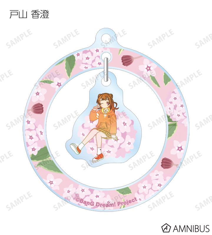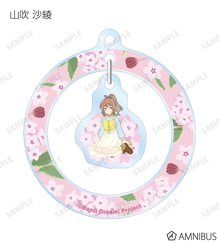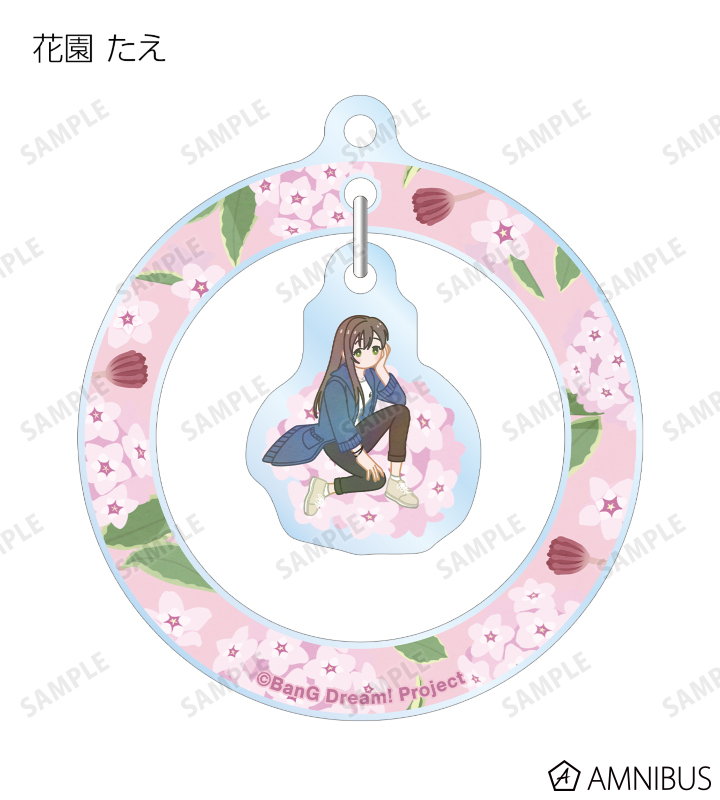 戸山 香澄、花園 たえ、牛込 りみ、山吹 沙綾、市ヶ谷 有咲、弦巻 こころ、瀬田 薫、北沢 はぐみ、松原 花音、奥沢 美咲のイラストをボタニカルデザインに落とし込んで繊細なタッチで新たに描き起こし、ゆらゆら動くアクリルキーホルダーに仕上げました。