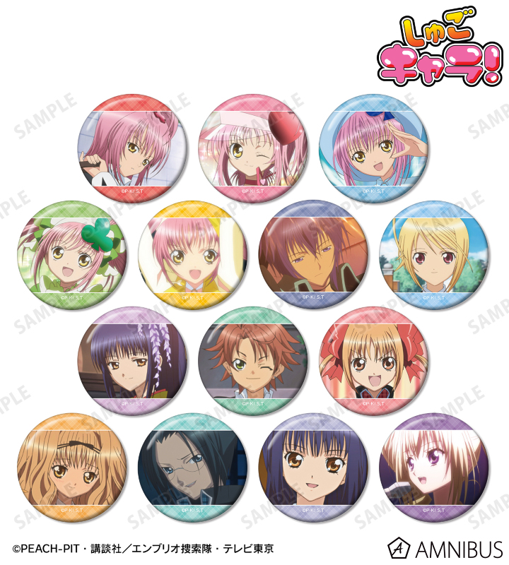 日奈森 あむ、アミュレットハート、アミュレットスペード、アミュレットクローバー、アミュレットダイヤ、月詠 イクト、辺里 唯世、藤咲 なでしこ、相馬 空海、結木 やや、真城 りま、三条 海里、藤咲 なぎひこ、ほしな 歌唄の印象的なシーンを缶バッジに仕上げました。