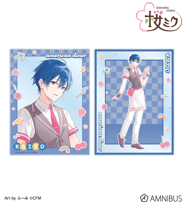 『桜ミク』×「ROUND1」のコラボレーションアイテム「描き下ろし KAITO アメリカンダイナーver. Art by ふーみ アクリルカード2枚セット」の登場です。
