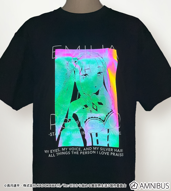 スマートフォンなどでフラッシュ撮影していただくと、エミリアがデザインされた部分がオーロラに光って写るTシャツです。