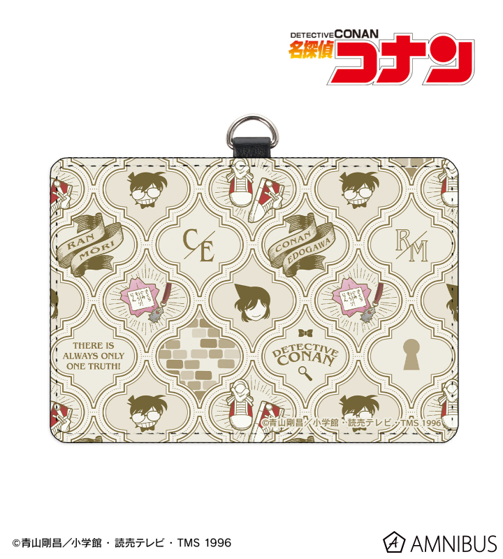 江戸川コナン、毛利蘭をイメージした描き起こしモチーフイラスト、作品名、キャラクターのイニシャルをネックストラップ付きのパスケースに仕上げました。