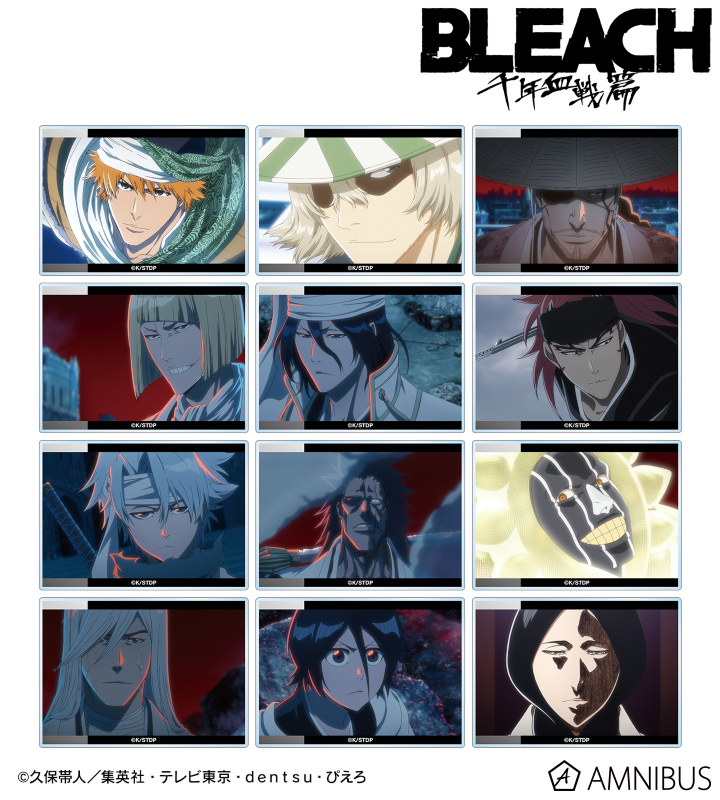 黒崎一護、浦原喜助、京楽春水、平子真子、朽木白哉、阿散井恋次、日番谷冬獅郎、更木剣八、涅マユリ、浮竹十四郎、朽木ルキア、卯ノ花烈の印象的なシーンをアクリルカードに仕上げました。