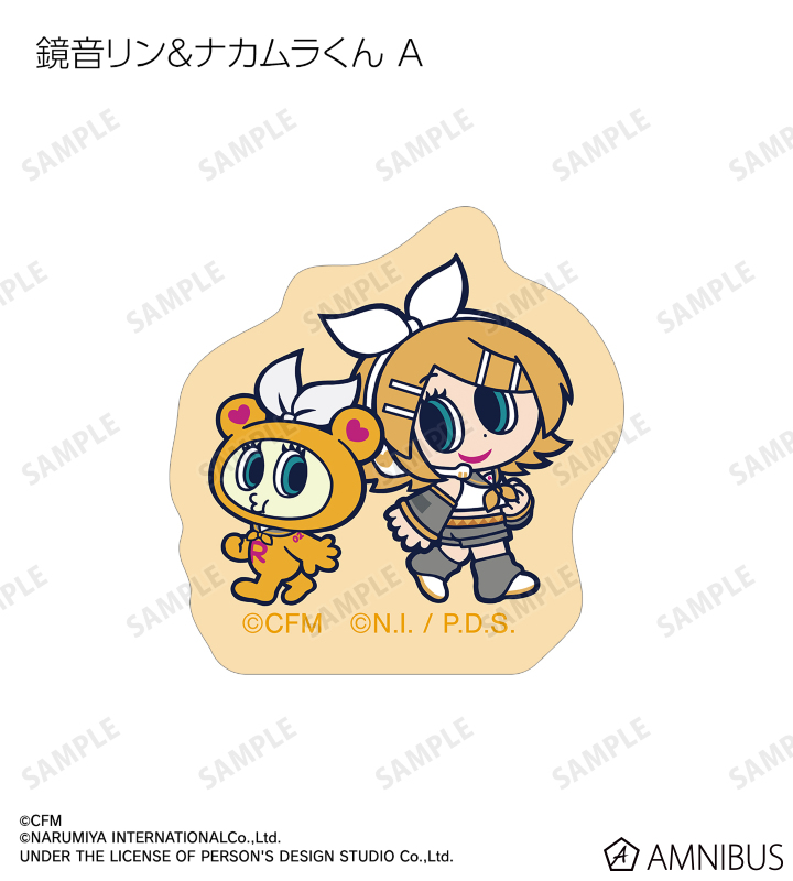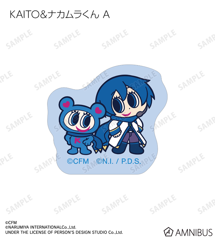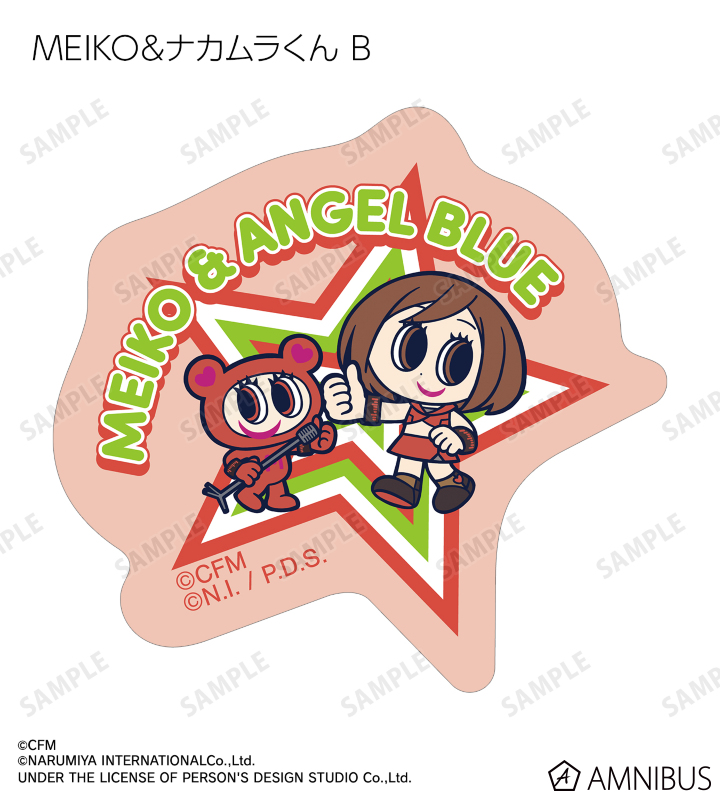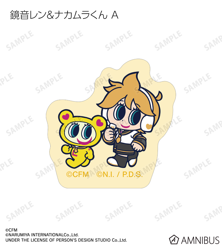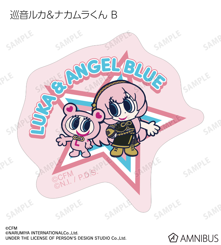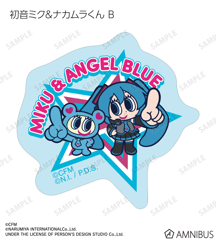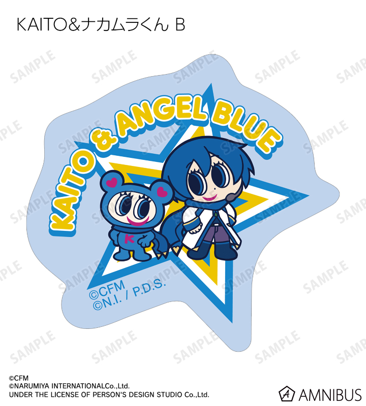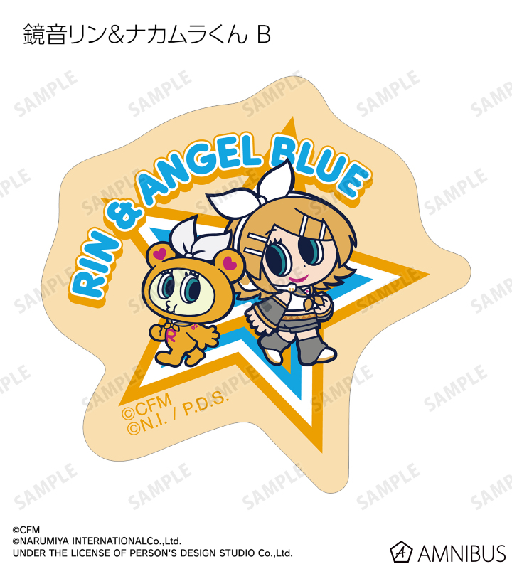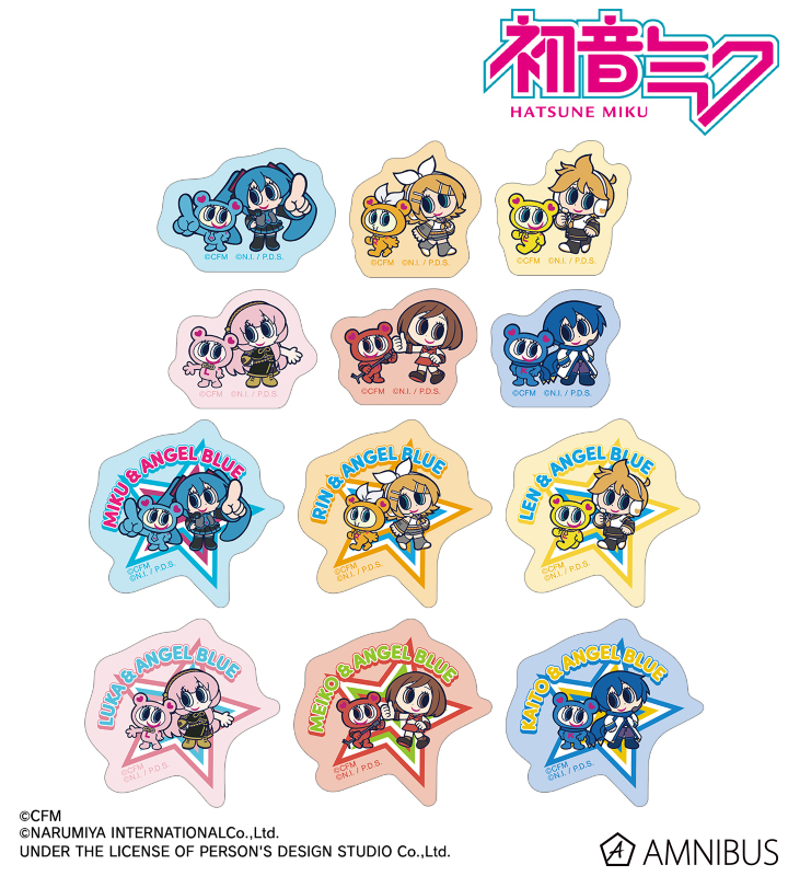 初音ミク、鏡音リン、鏡音レン、巡音ルカ、MEIKO、KAITO、ナカムラくんを描き起こしたANGEL BLUEのコラボイラストを、フレークシールに仕上げました。