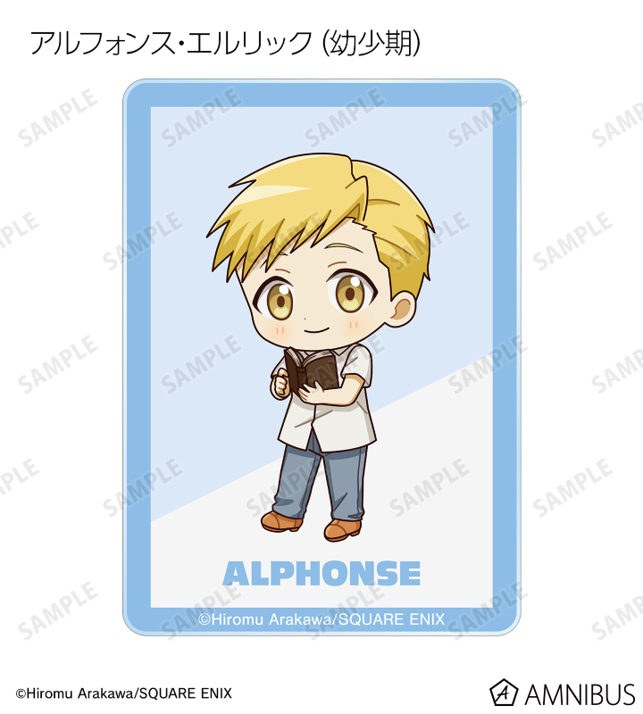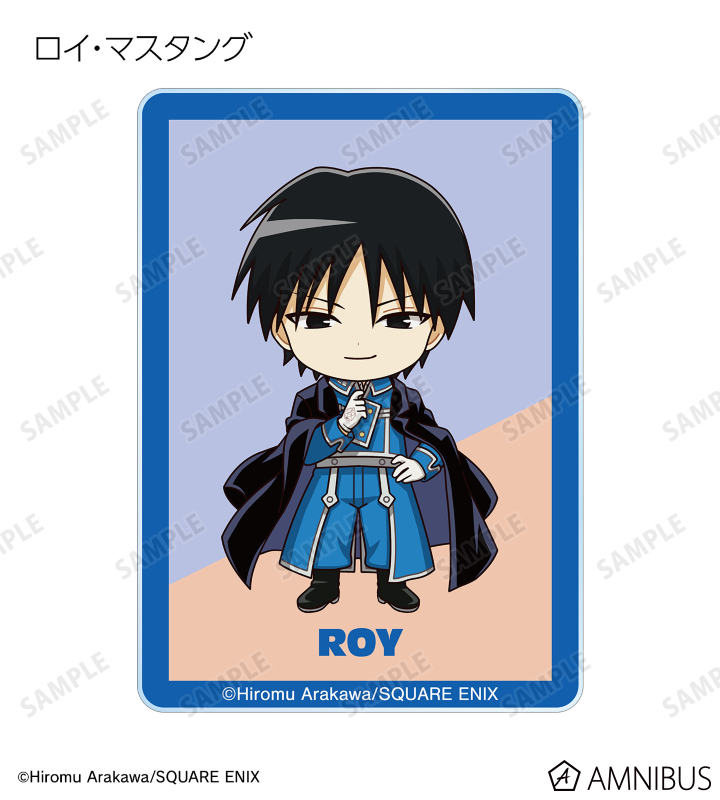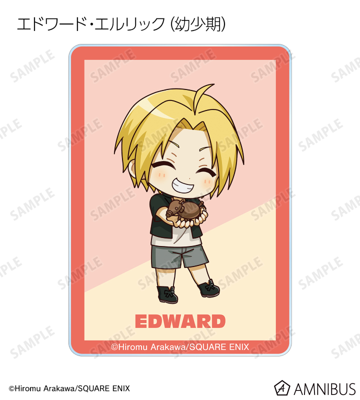 エドワード・エルリック、アルフォンス・エルリック、エドワード・エルリック(幼少期)、アルフォンス・エルリック(幼少期)、ウィンリィ・ロックベル、ロイ・マスタング、リザ・ホークアイ、マース・ヒューズ、ジャン・ハボック、リン・ヤオ、メイ・チャン&シャオメイの描き起こしちびキャライラストをメインにデザインし、アクリルカードに仕上げました。