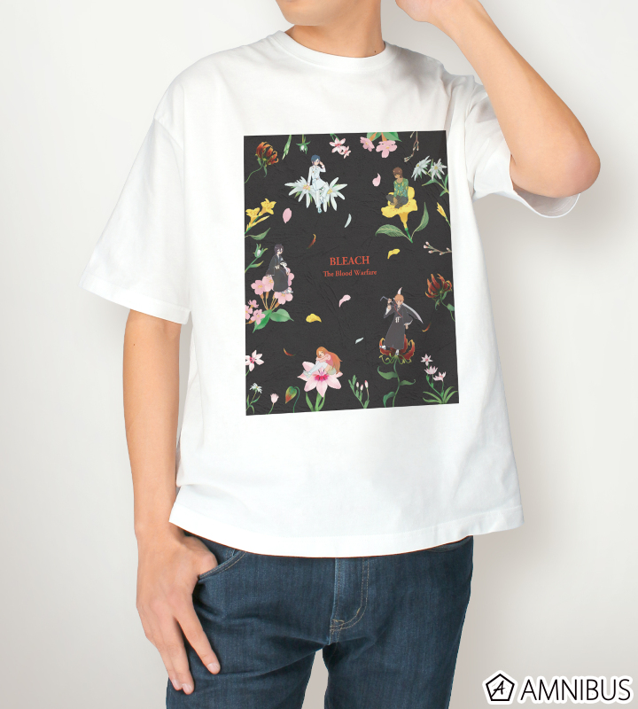 黒崎一護、井上織姫、茶渡泰虎、朽木ルキア、石田雨竜のイラストをボタニカルデザインに落とし込んで繊細なタッチで新たに描き起こし、BIGなシルエットTシャツに仕上げました。