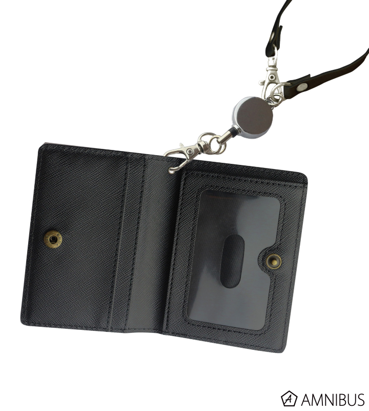 コンパクトに持ち運びいただける2つ折りタイプで、カード収納のできるポケットが4つと便利なリールストラップ付きです。
