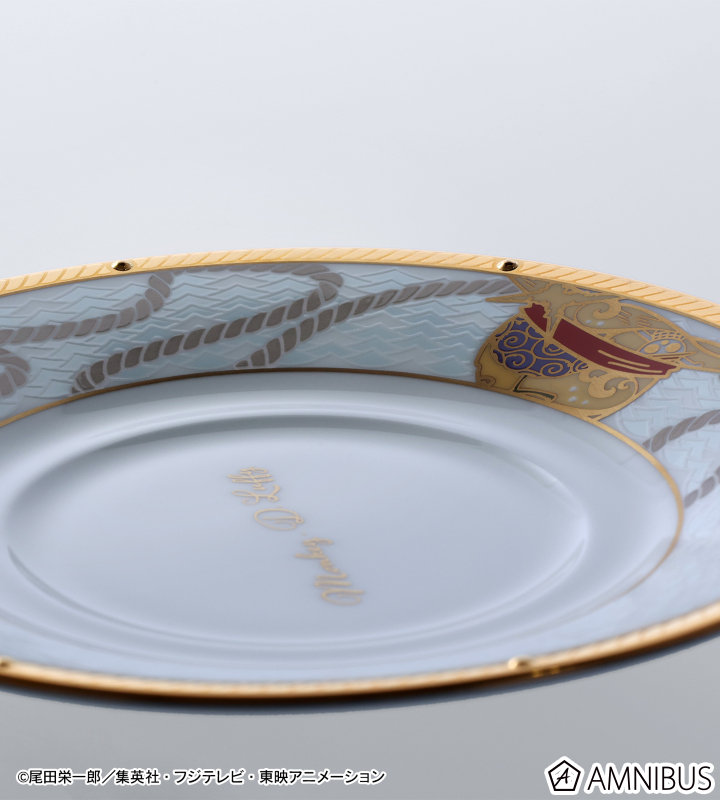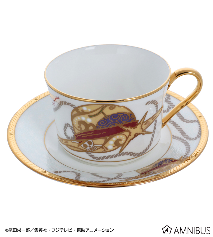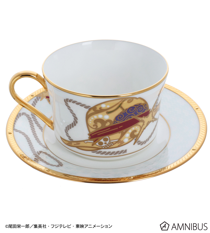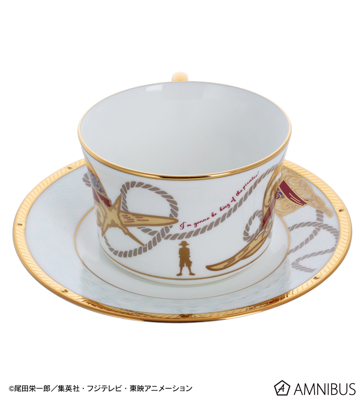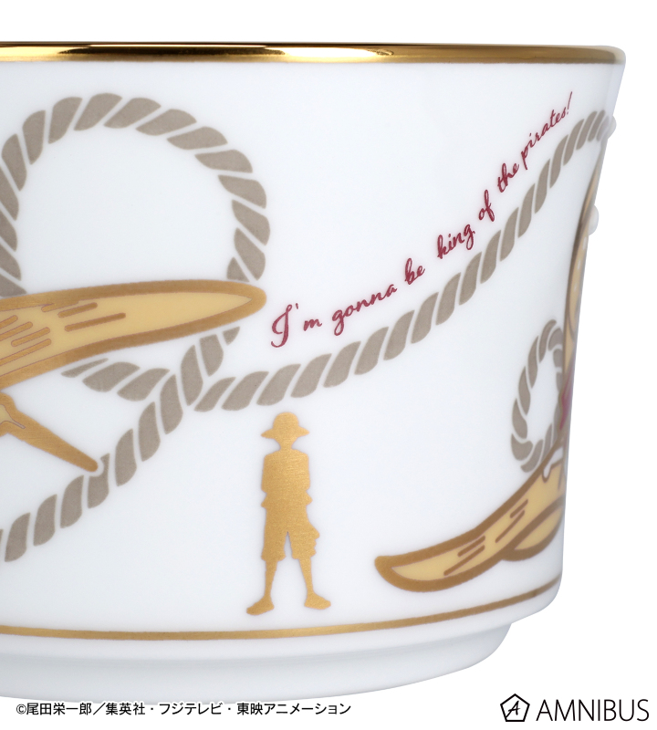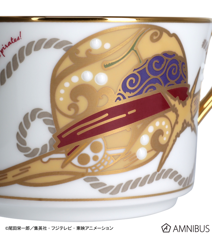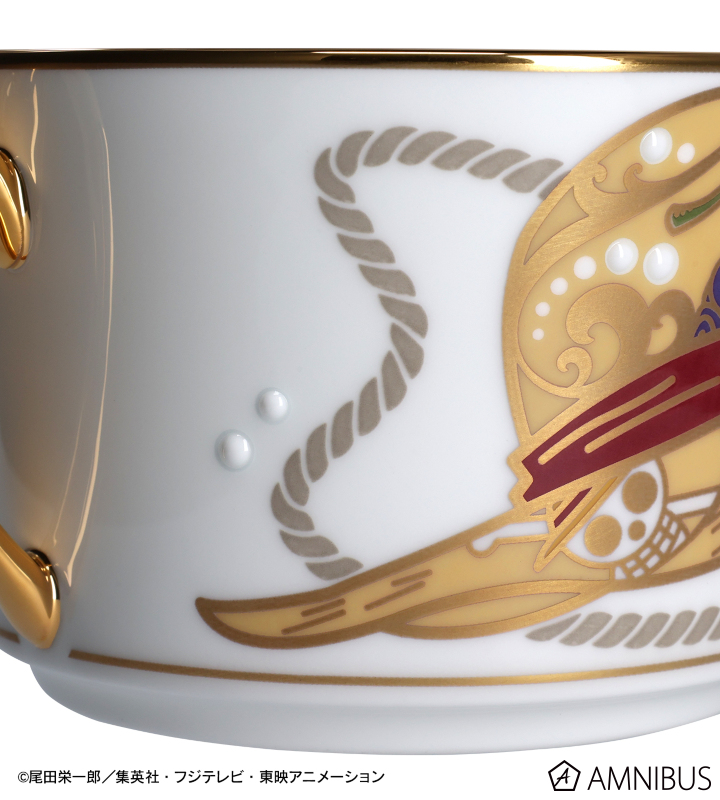 ルフィのシルエット、モチーフや文字をはじめ、カップの口線、取手、ソーサーの淵にも金を使用しており、また、カップは水の飛沫、ソーサーは波を、立体的に表現したリッチな仕様となっております。