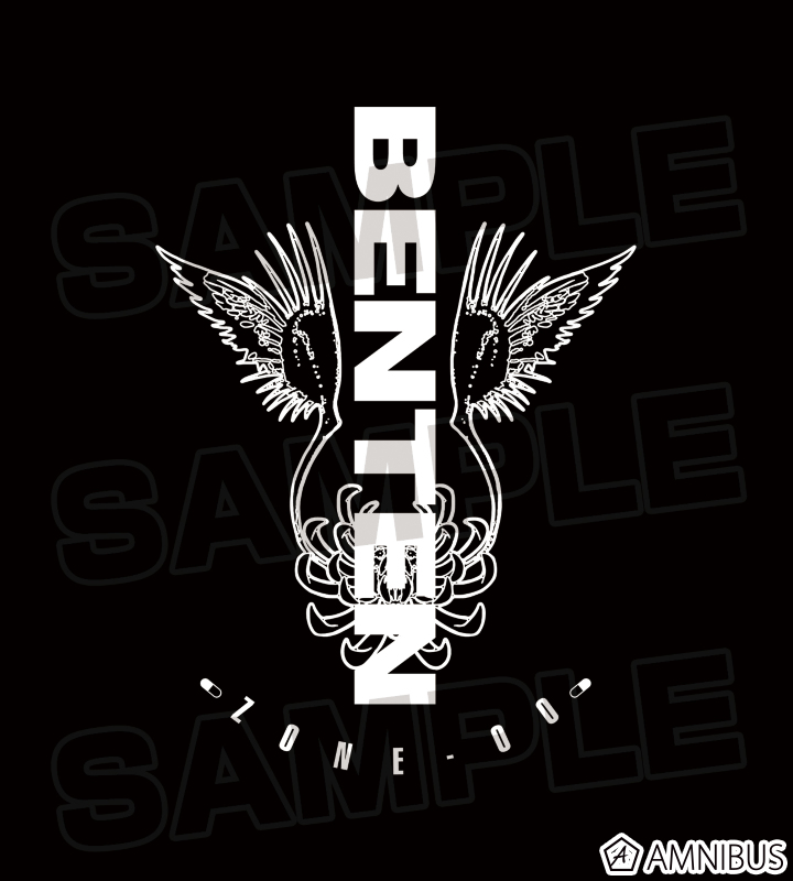 弁天の背中の刺青と名前を組み合わせてモノクロに仕上げたデザインをバックに大きくレイアウトしました。