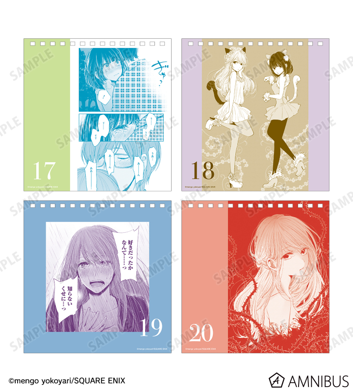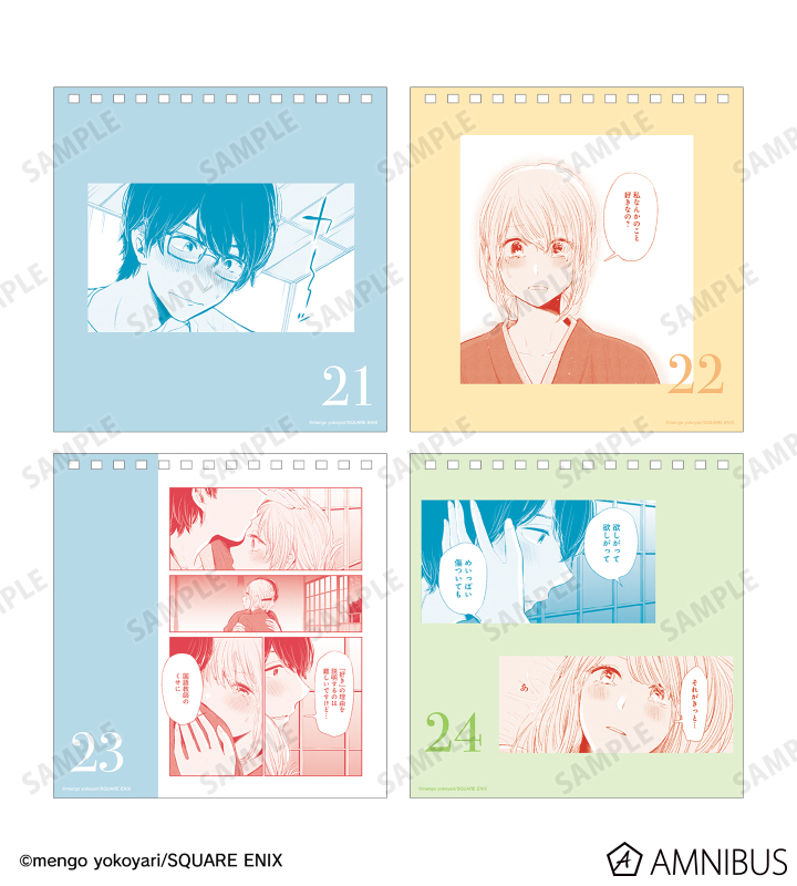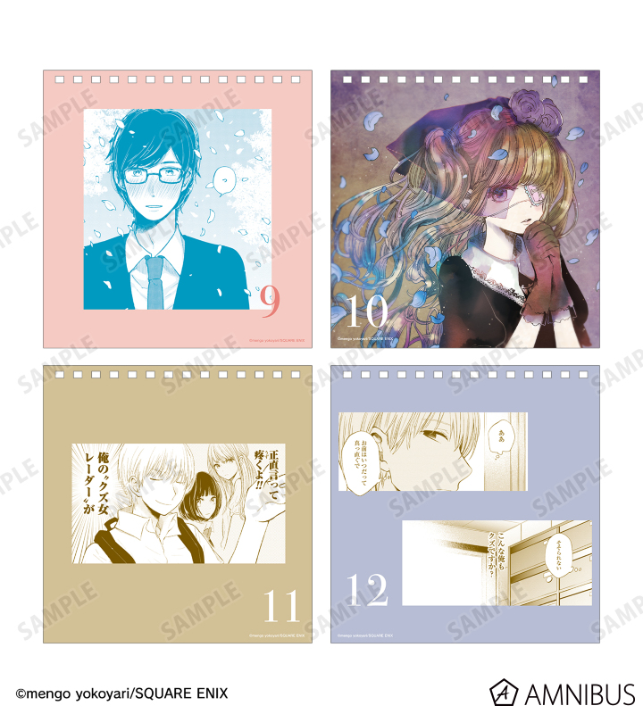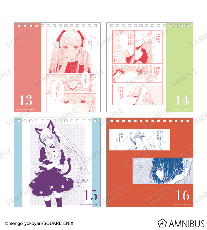 安楽岡花火、粟屋 麦、絵鳩早苗、鴎端のり子、鐘井鳴海、皆川 茜の原作コマ、イラストを日替わりでお楽しみいただける日めくりカレンダーに仕上げました。