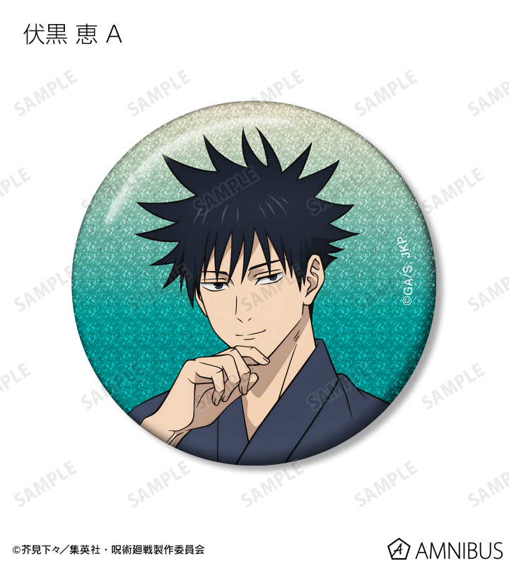 虎杖悠仁、伏黒 恵、釘崎野薔薇、七海建人、五条 悟の描き下ろしイラストをグリッター加工を施した缶バッジに仕上げました。