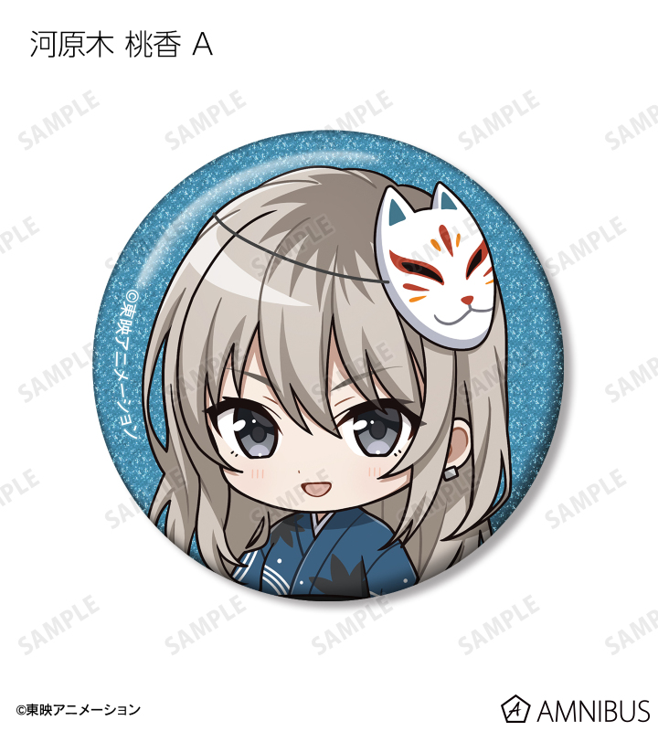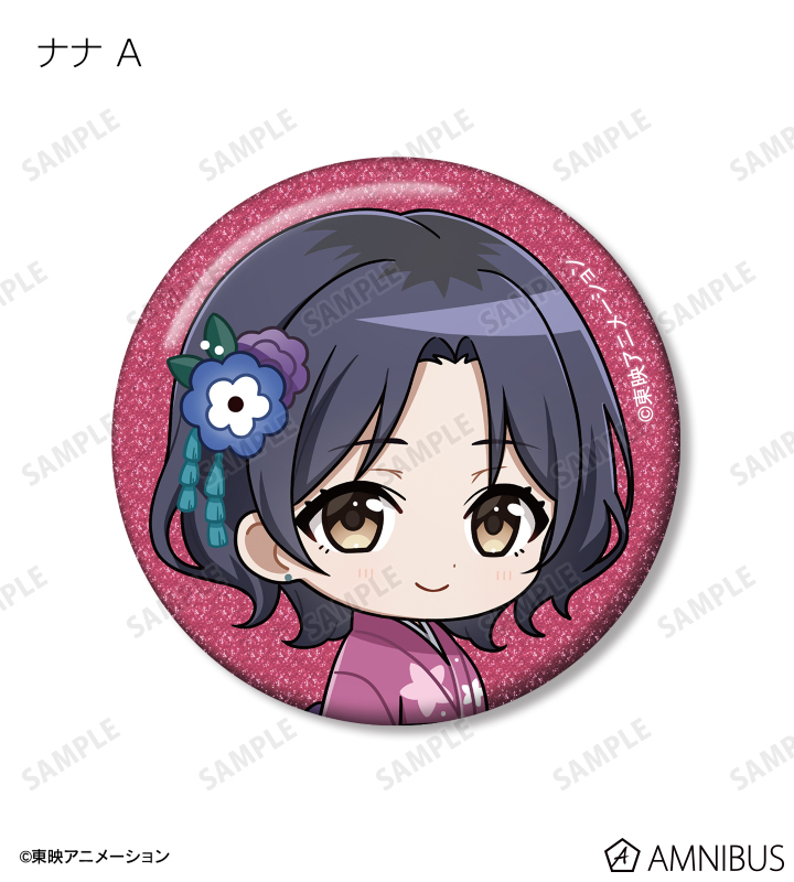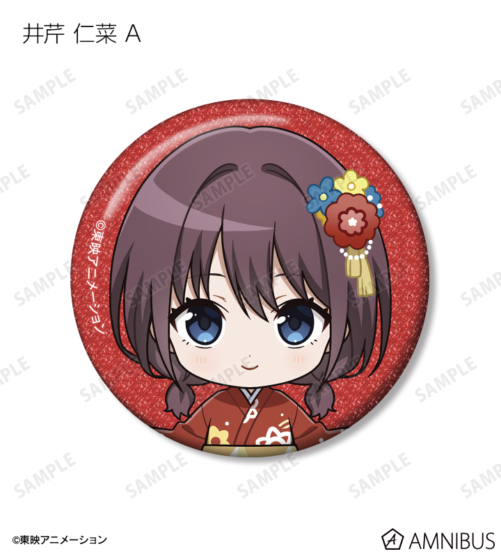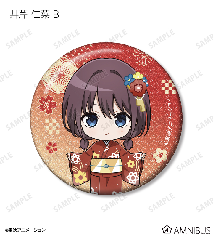 井芹 仁菜、河原木 桃香、安和 すばる、海老塚 智、ルパ、ヒナ、リン、ナナ、アイの描き起こしちびキャライラストをメインにデザインし、グリッター加工を施した缶バッジに仕上げました。