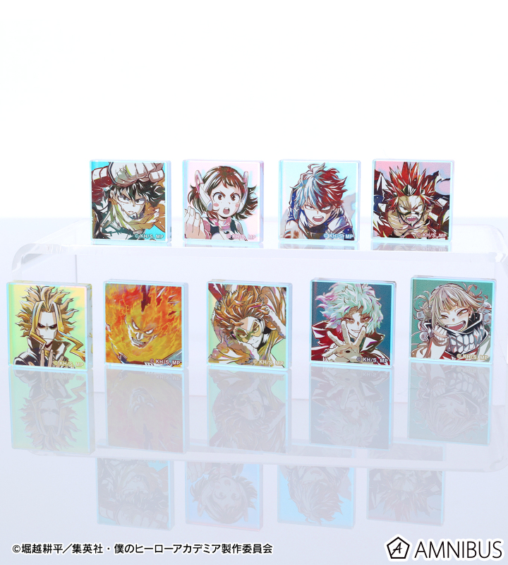 緑谷出久、麗日お茶子、轟焦凍、切島鋭児郎、オールマイト、エンデヴァー、ホークス、死柄木弔、トガヒミコのビジュアルを新たなタッチで魅力的に表現し、オーロラアクリルタイルに仕上げました。