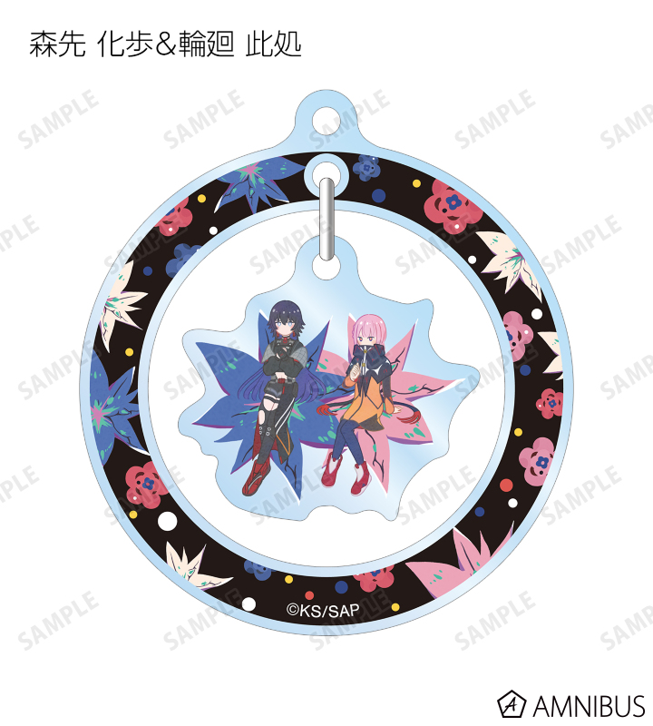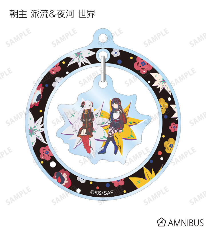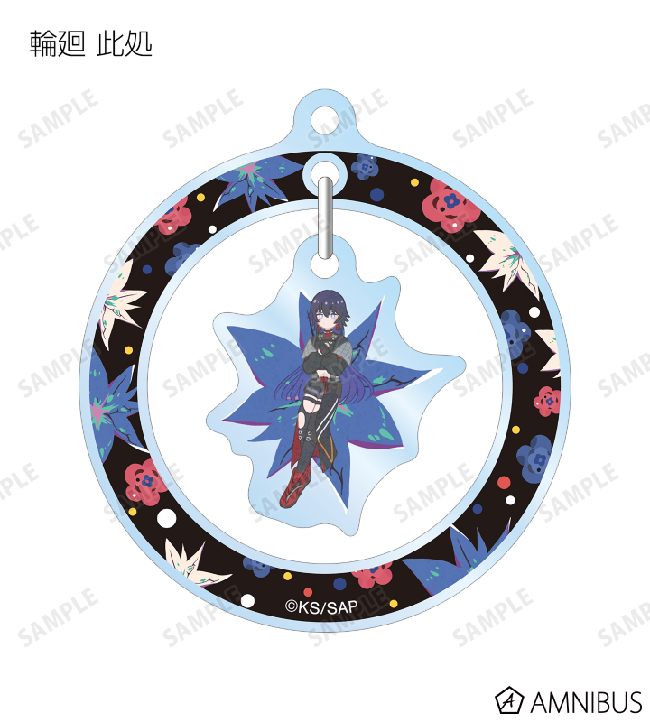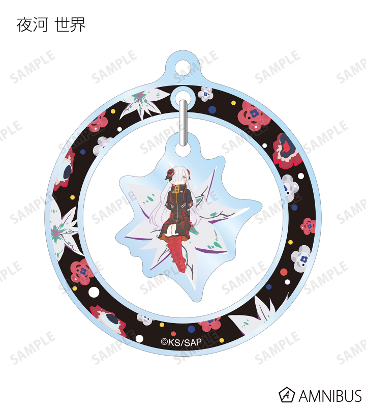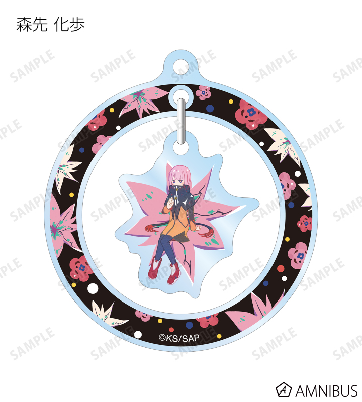 森先 化歩、谷置 狸眼、朝主 派流、夜河 世界、輪廻 此処のイラストをボタニカルデザインに落とし込んで繊細なタッチで新たに描き起こし、ゆらゆら動くアクリルキーホルダーに仕上げました。