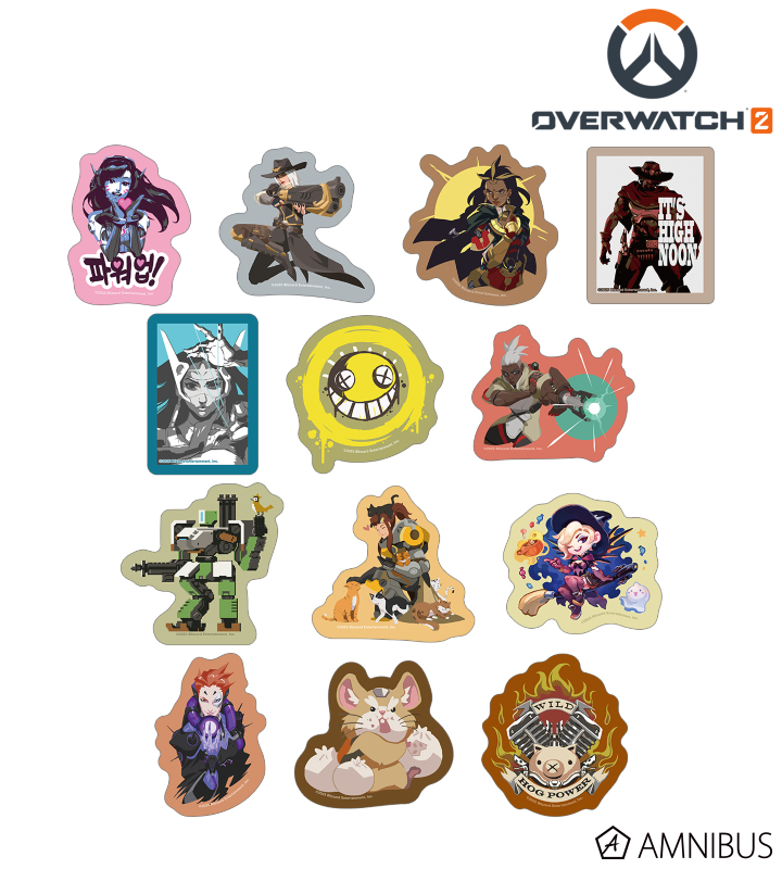 D.Va、アッシュ、イラリー、キャスディ、シンメトラ、ジャンクラット、ソジョーン、バスティオン、ブリギッテ、マーシー、モイラ、レッキング・ボール、ロードホッグのイラストをダイカットのステッカーに仕上げました。
