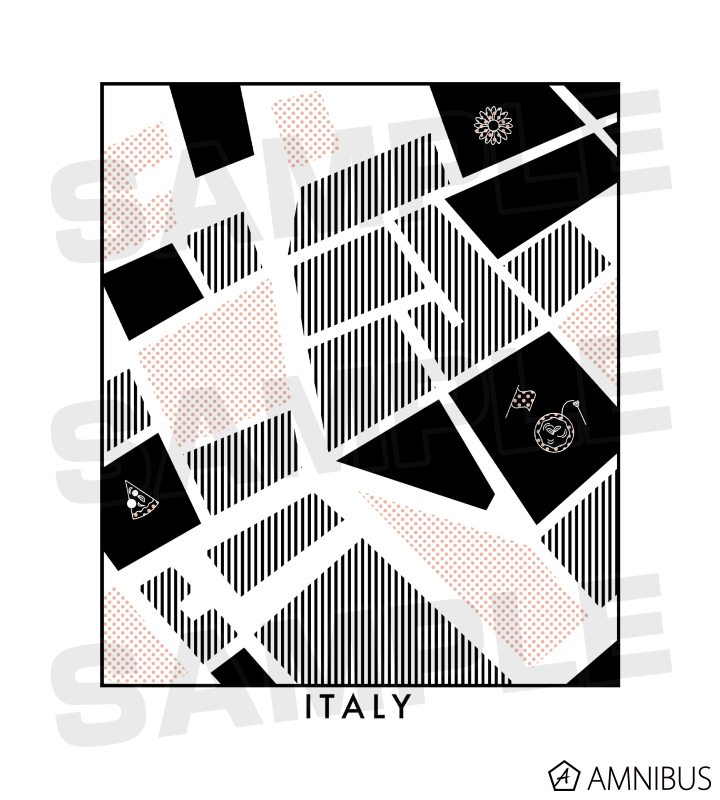 イタリアをイメージした地図にデイジー、ピッツァ、白旗、パスタなどのイタリアに馴染みのあるモチーフを散りばめたデザインに仕上げました。