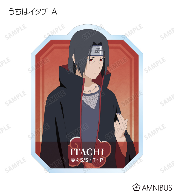 うずまきナルト、うちはサスケ、はたけカカシ、うちはイタチの描き下ろしイラストをダイカットのステッカーに仕上げました。