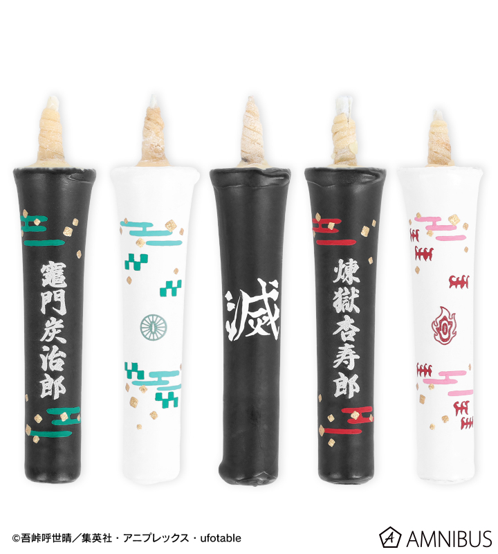 鬼殺隊は「滅」マーク、竈門炭治郎は名前と日輪刀の鍔・羽織の柄、煉󠄁獄杏寿郎は名前と日輪刀の鍔・炎の模様をイメージしたろうそくにデザインしました。