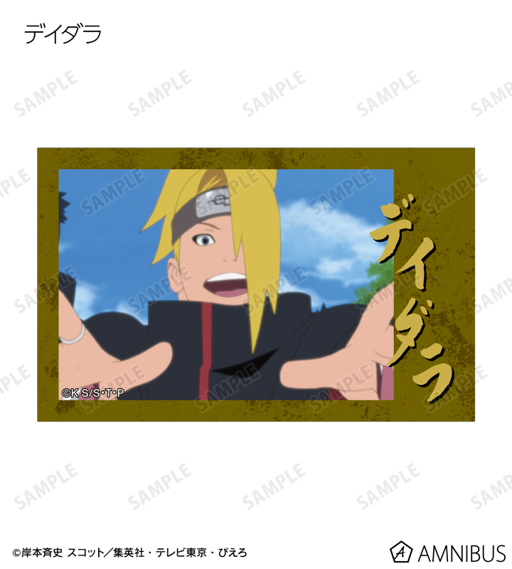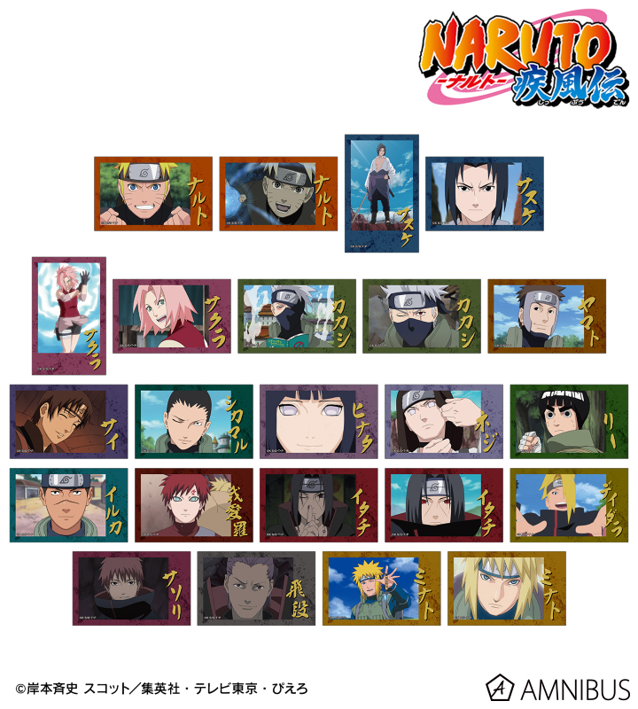 うずまきナルト、うちはサスケ、春野サクラ、はたけカカシ、ヤマト、サイ、奈良シカマル、日向ヒナタ、日向ネジ、ロック・リー、うみのイルカ、我愛羅、うちはイタチ、デイダラ、サソリ、飛段、波風ミナトの印象的なシーンをインスタントカメラ風のイラストシートに仕上げました。