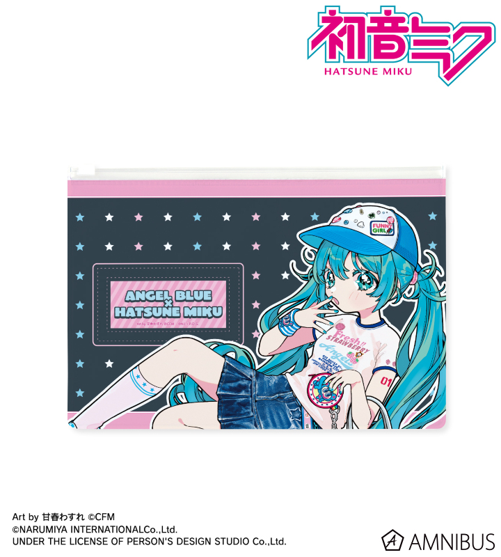 『初音ミク』×「ANGEL BLUE」のコラボレーションアイテム「ANGEL BLUEコラボ 描き下ろし 初音ミク Art by 甘春わすれ ビニールフラットポーチ ver.A」の登場です。
