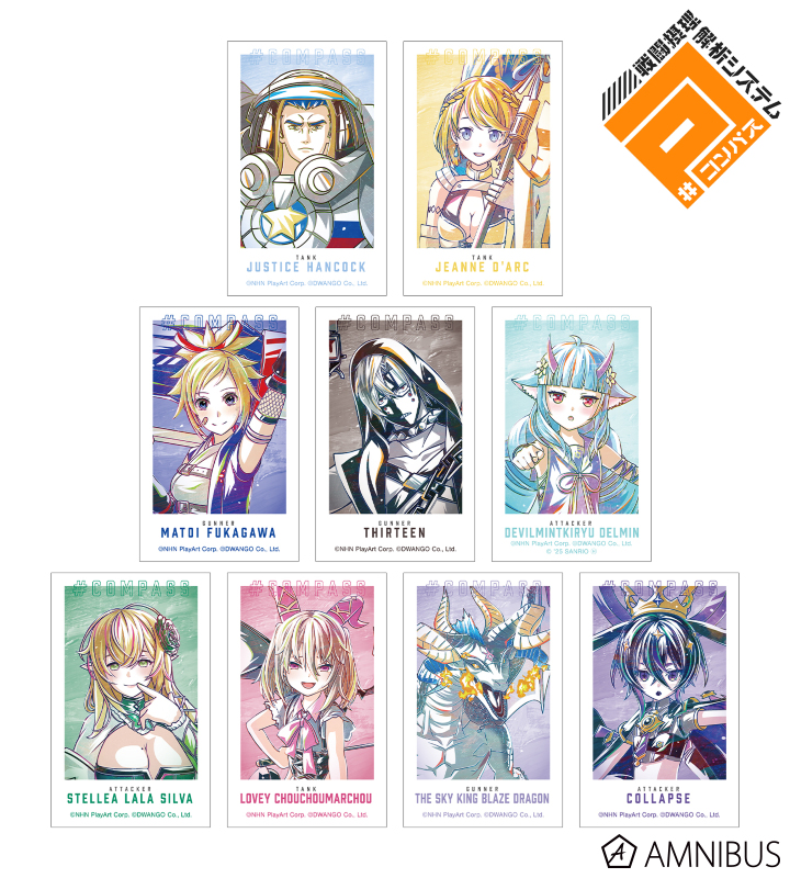 ジャスティス ハンコック、ジャンヌ ダルク、深川 まとい、13†サーティーン†、デビルミント鬼龍 デルミン、ステリア・ララ・シルワ、ラヴィ・シュシュマルシュ、天空王 ぶれいずどらごん、コラプスのイラストを新たなタッチで魅力的に表現し、インスタントカメラ風のイラストカードに仕上げました。