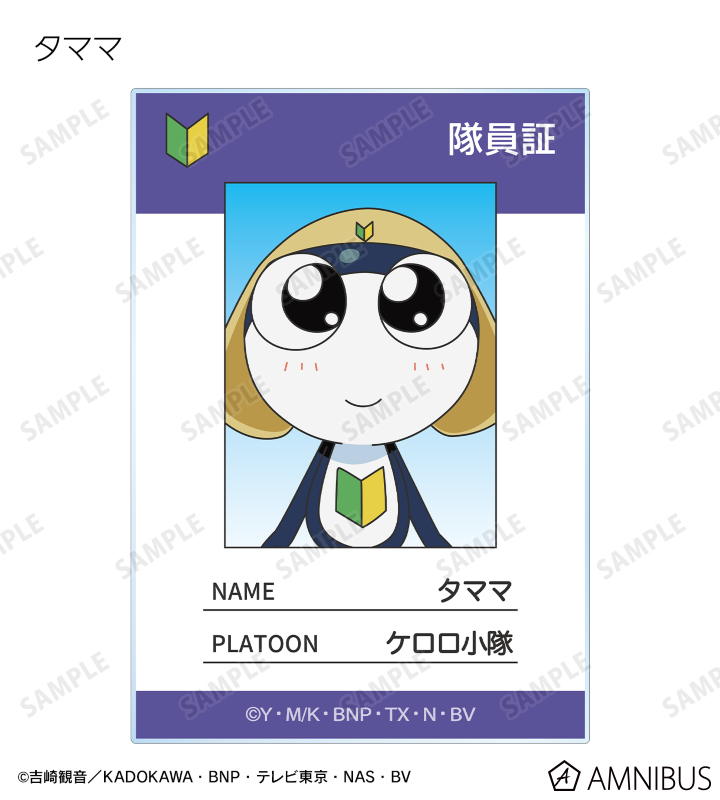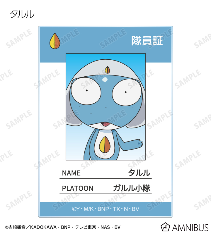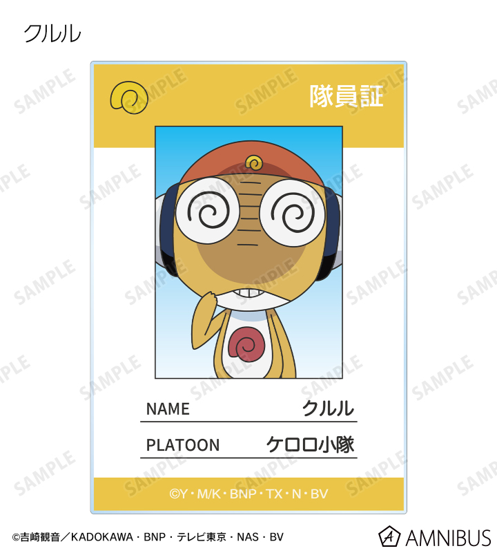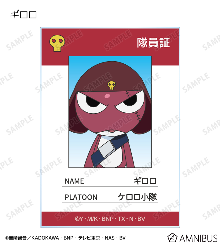 ケロロ、タママ、ギロロ、クルル、ドロロ、ガルル、タルル、トロロ、ゾルル、プルルのイラストとキャラクターのマークを、隊員証風のアクリルカードに仕上げました。