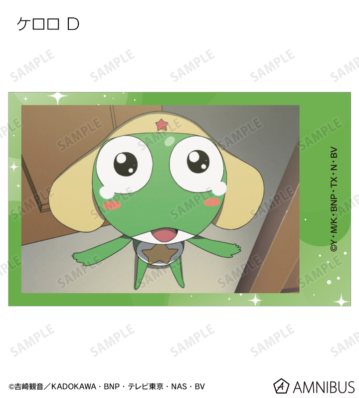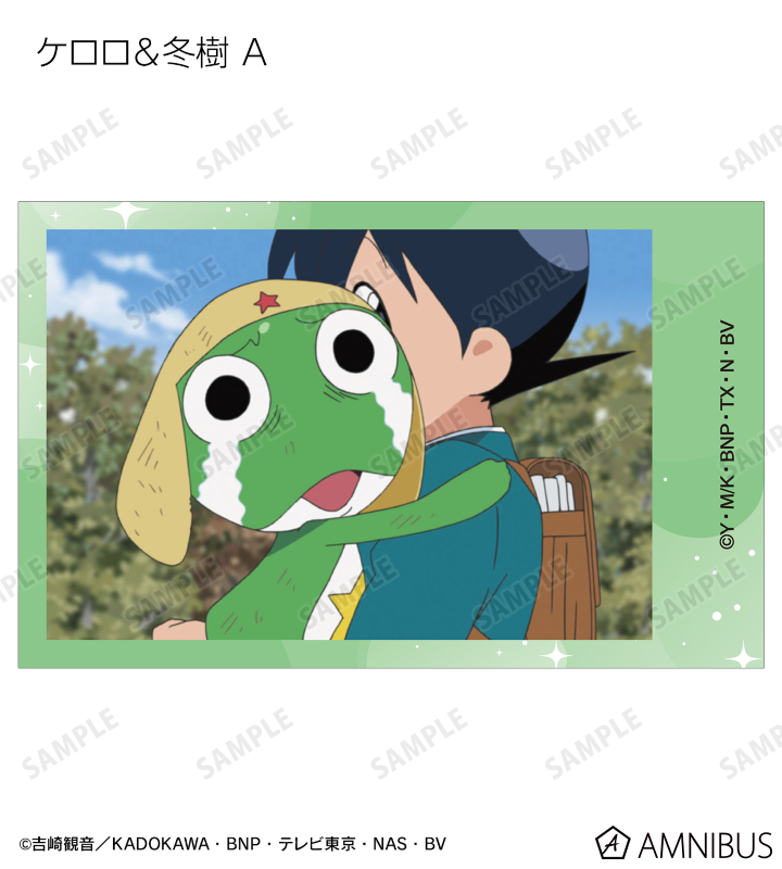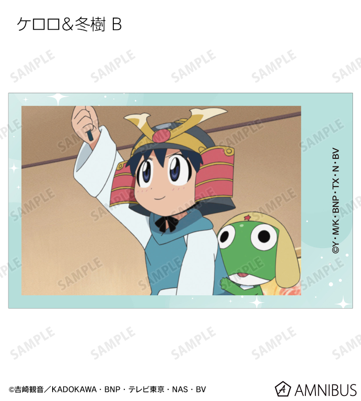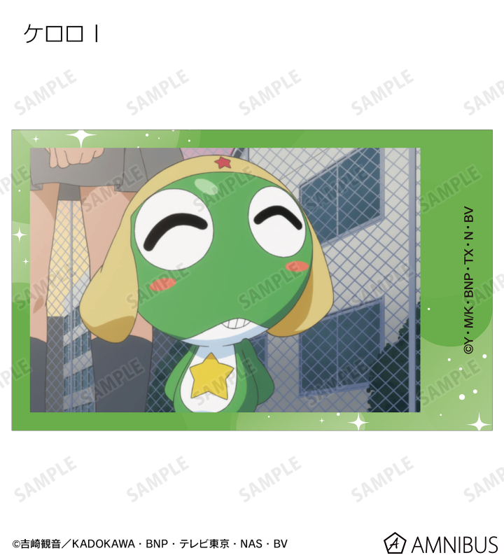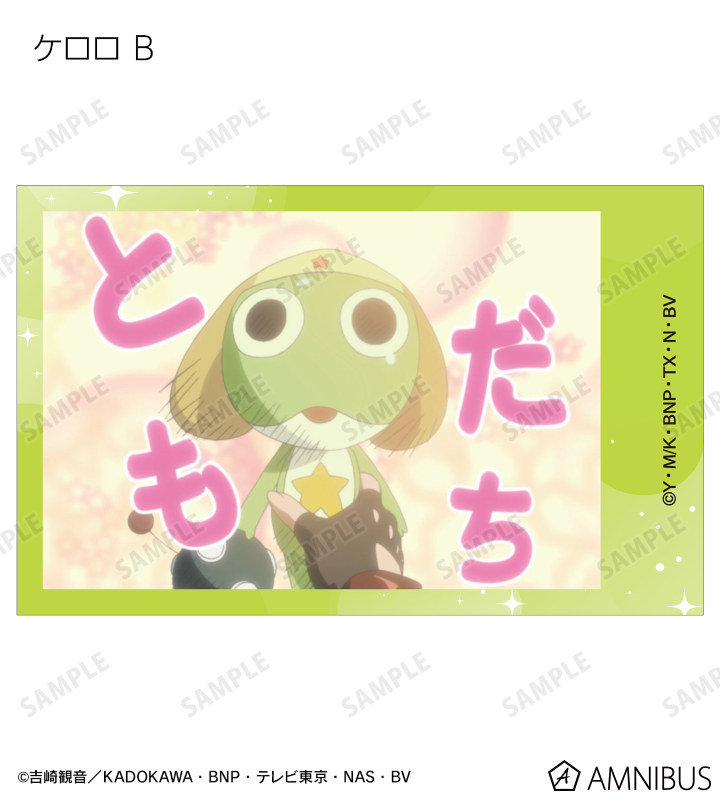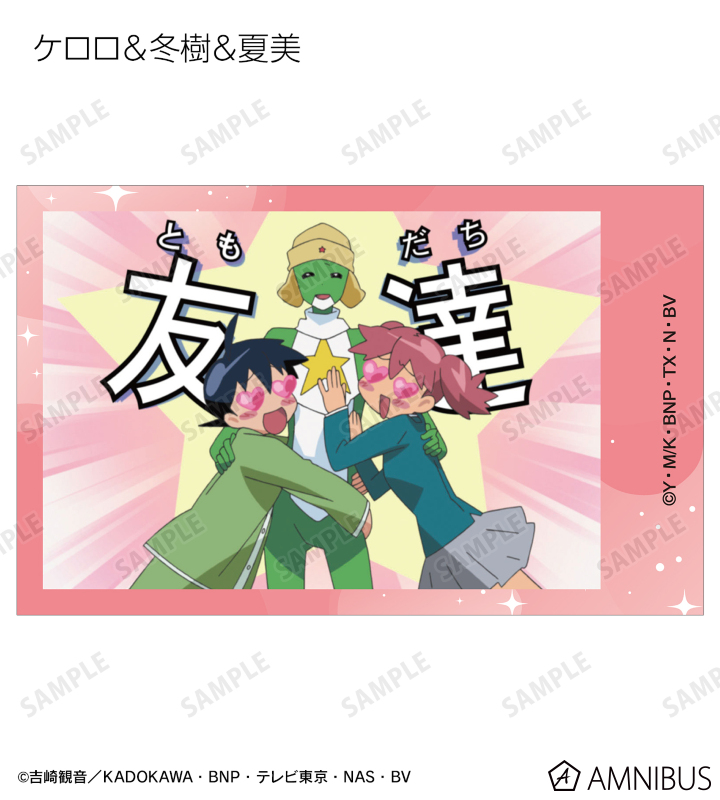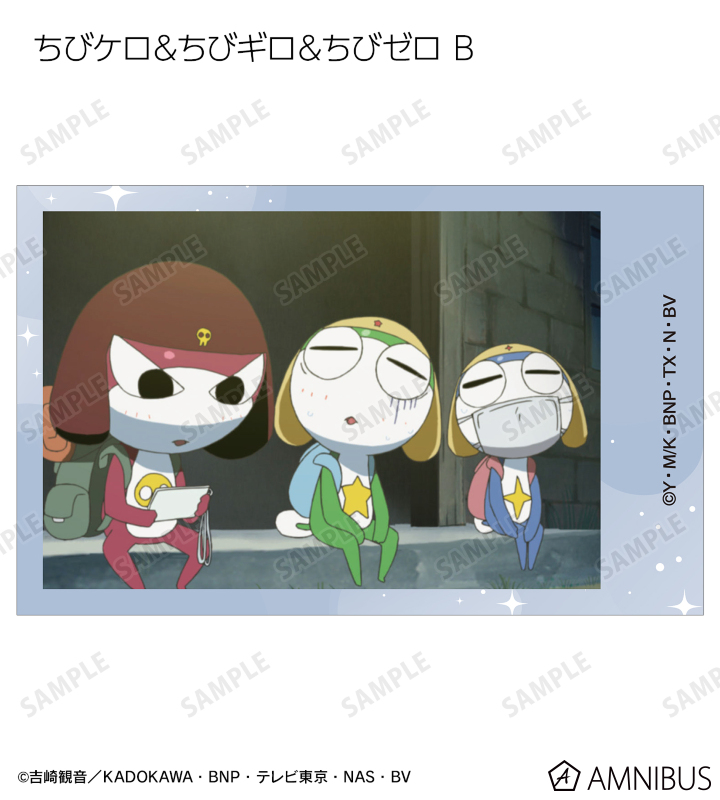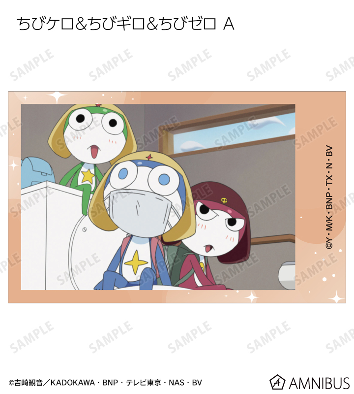 ケロロ、タママ、ギロロ、クルル、ドロロ、冬樹、夏美、桃華、サブロー、小雪、ちびケロ、ちびギロ、ちびゼロの印象的なシーンをイラストカード3枚セットに仕上げました。