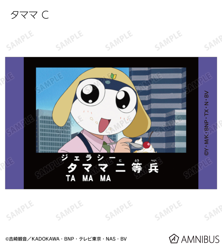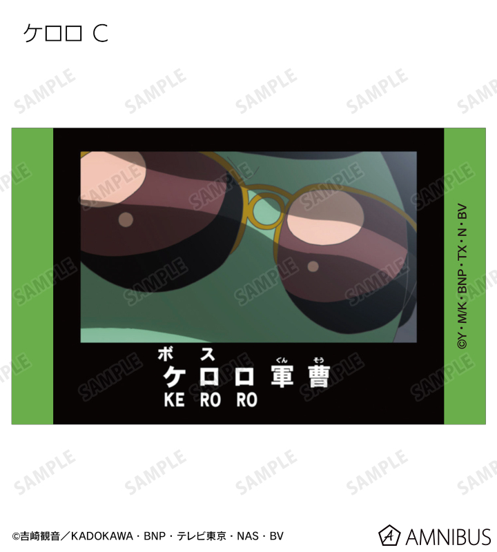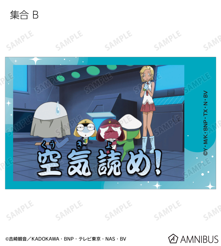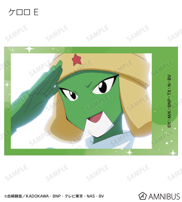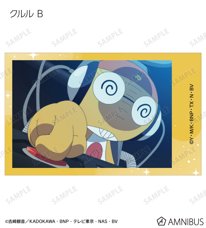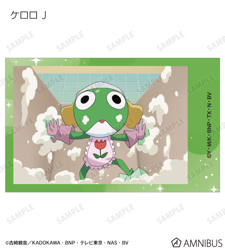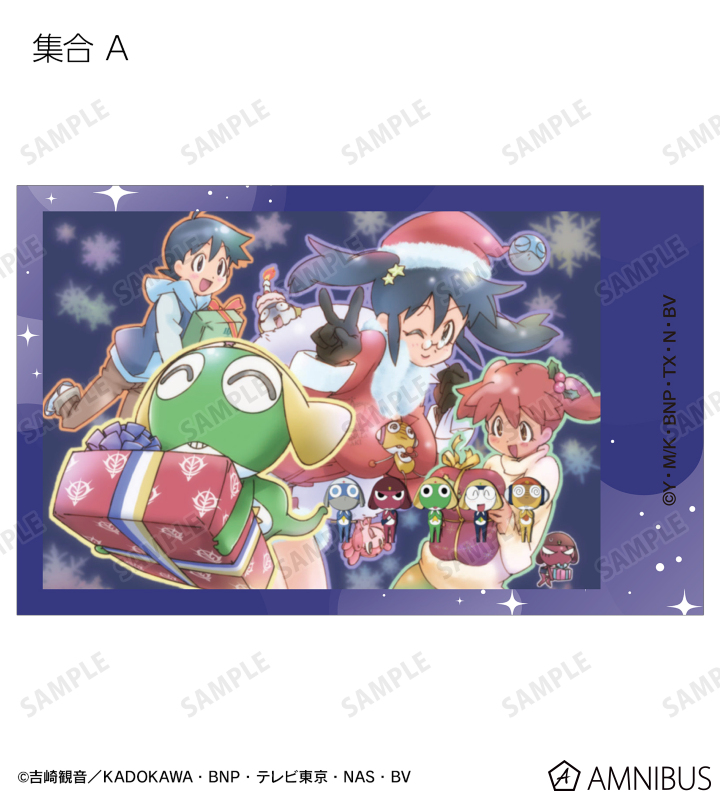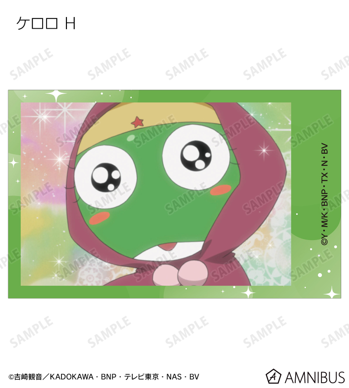 ケロロ、タママ、ギロロ、クルル、ドロロ、冬樹、夏美、桃華、サブロー、小雪、ちびケロ、ちびギロ、ちびゼロの印象的なシーンをイラストカード3枚セットに仕上げました。