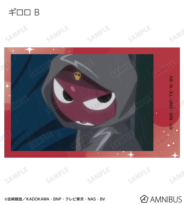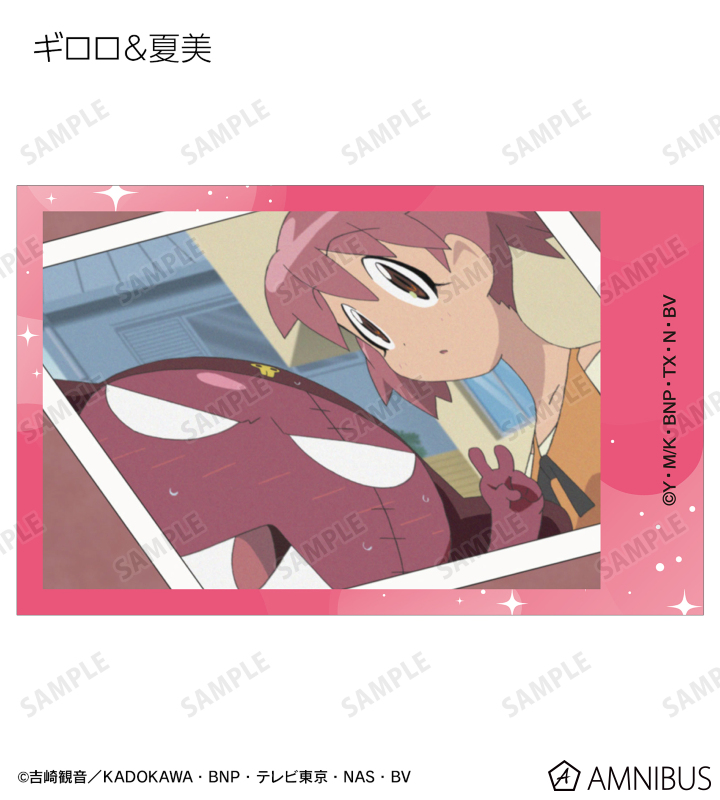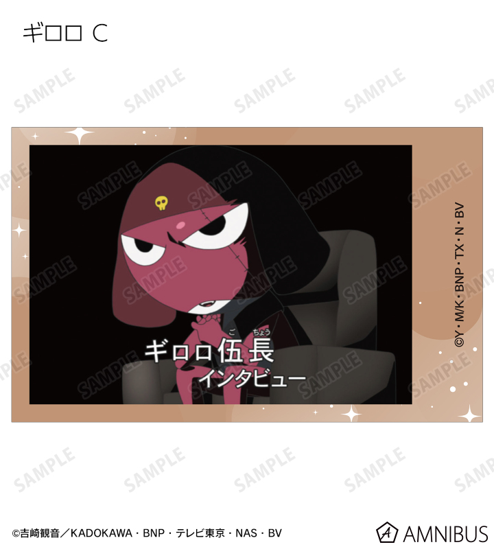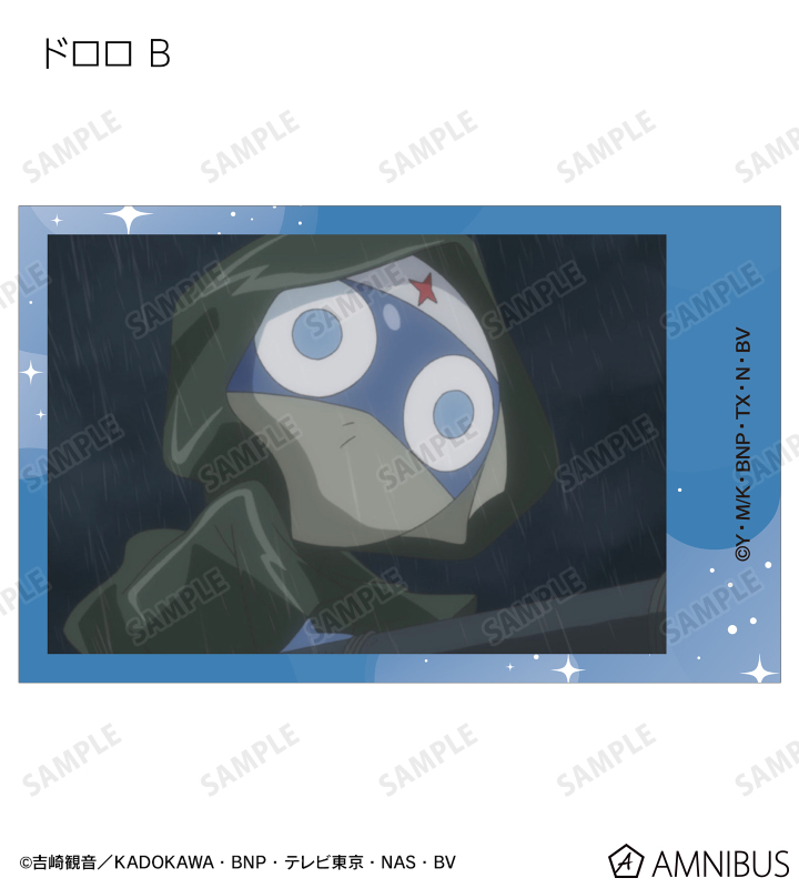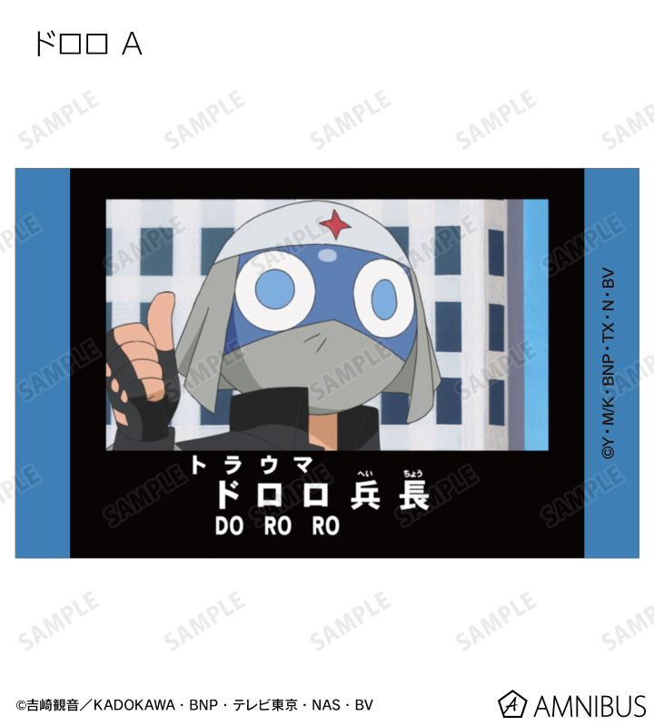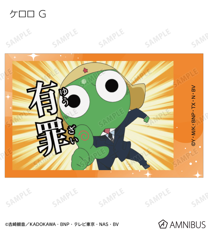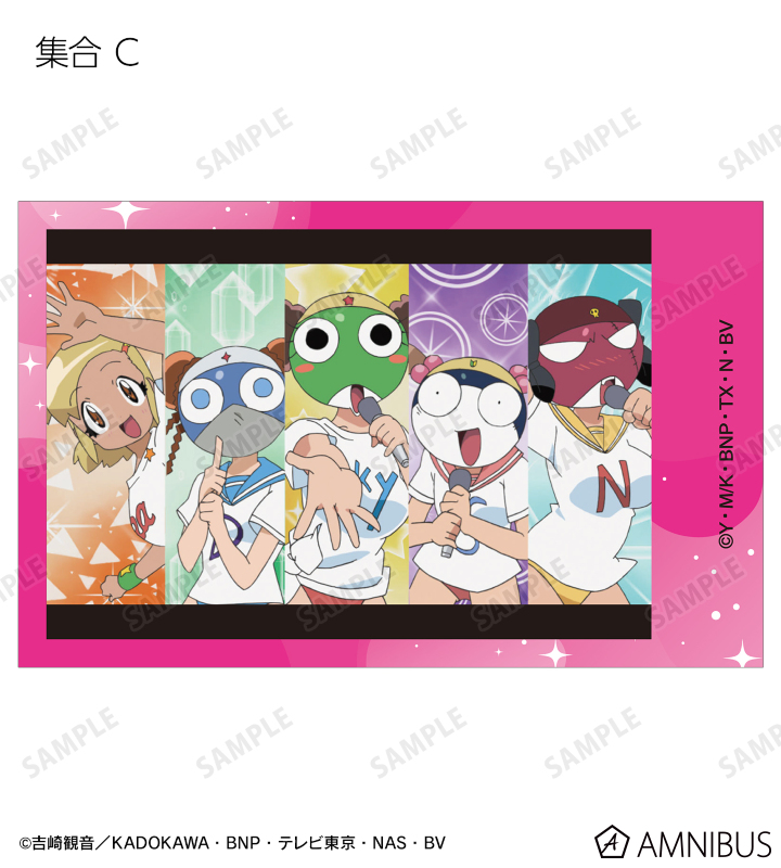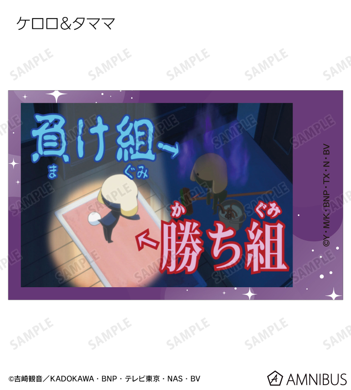 ケロロ、タママ、ギロロ、クルル、ドロロ、冬樹、夏美、桃華、サブロー、小雪、ちびケロ、ちびギロ、ちびゼロの印象的なシーンをイラストカード3枚セットに仕上げました。