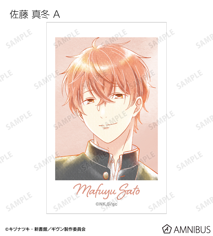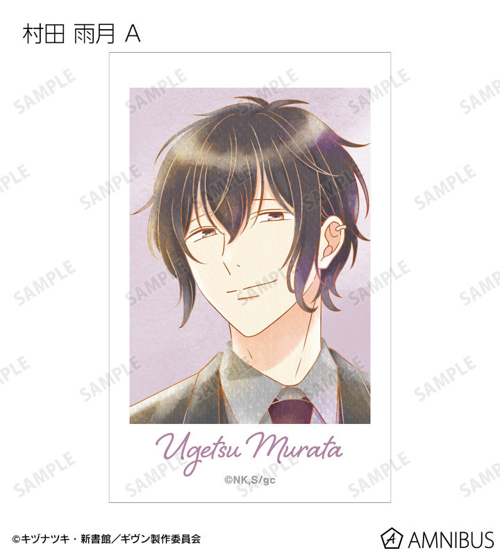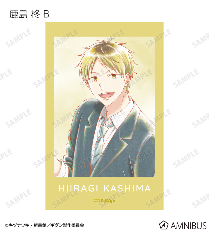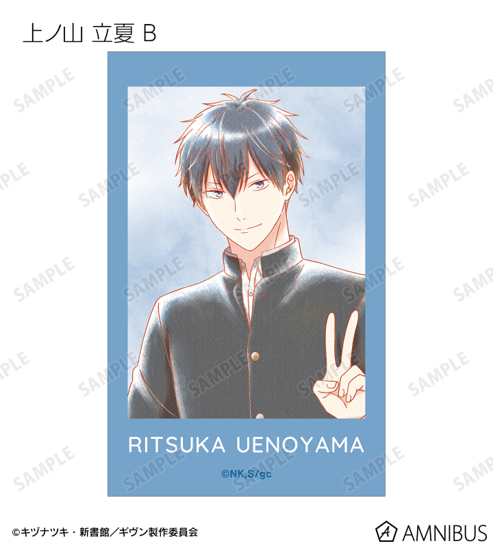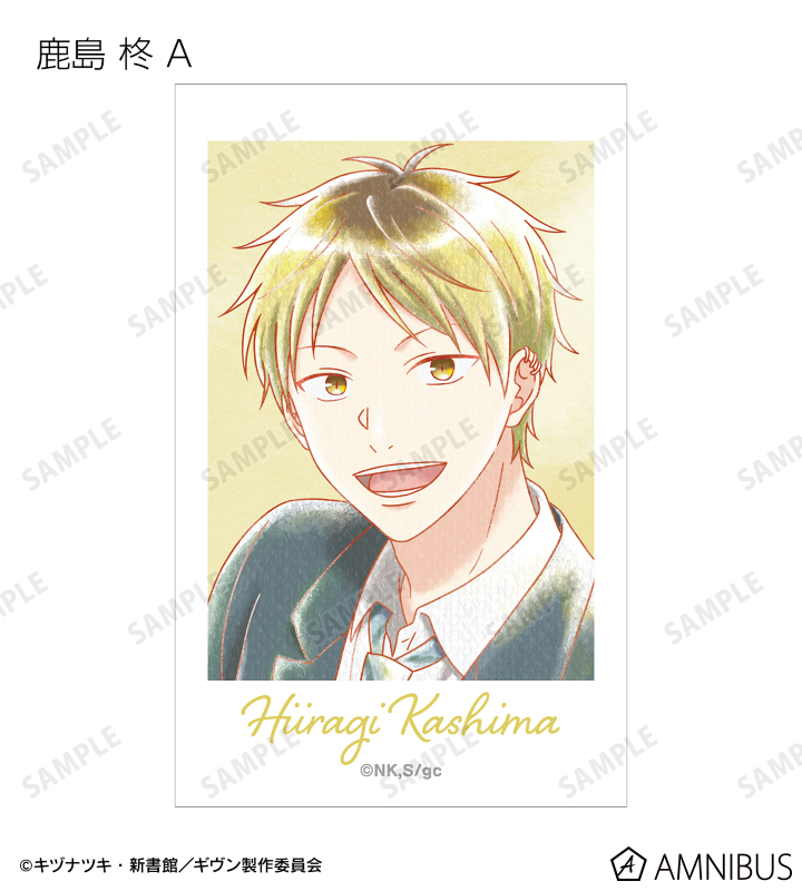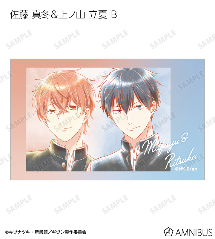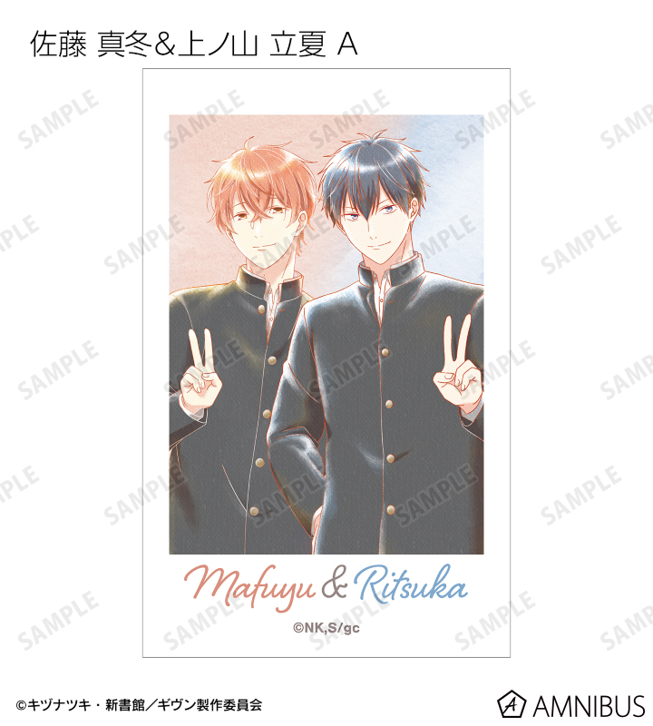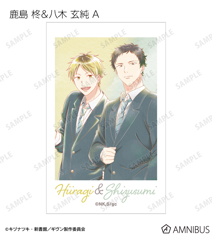 佐藤 真冬、上ノ山 立夏、中山 春樹、梶 秋彦、鹿島 柊、八木 玄純、村田 雨月のイラストを新たなタッチで魅力的に表現し、水彩風デザインのインスタントカメラ風のイラストカード2枚セットに仕上げました。