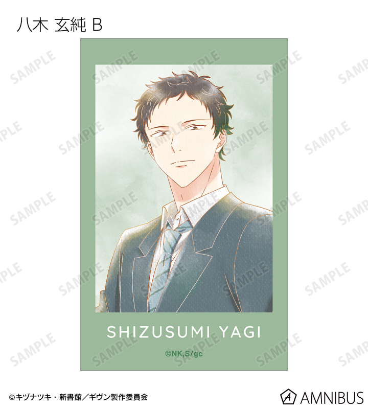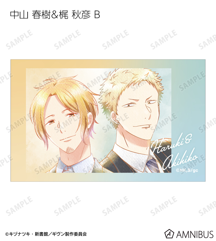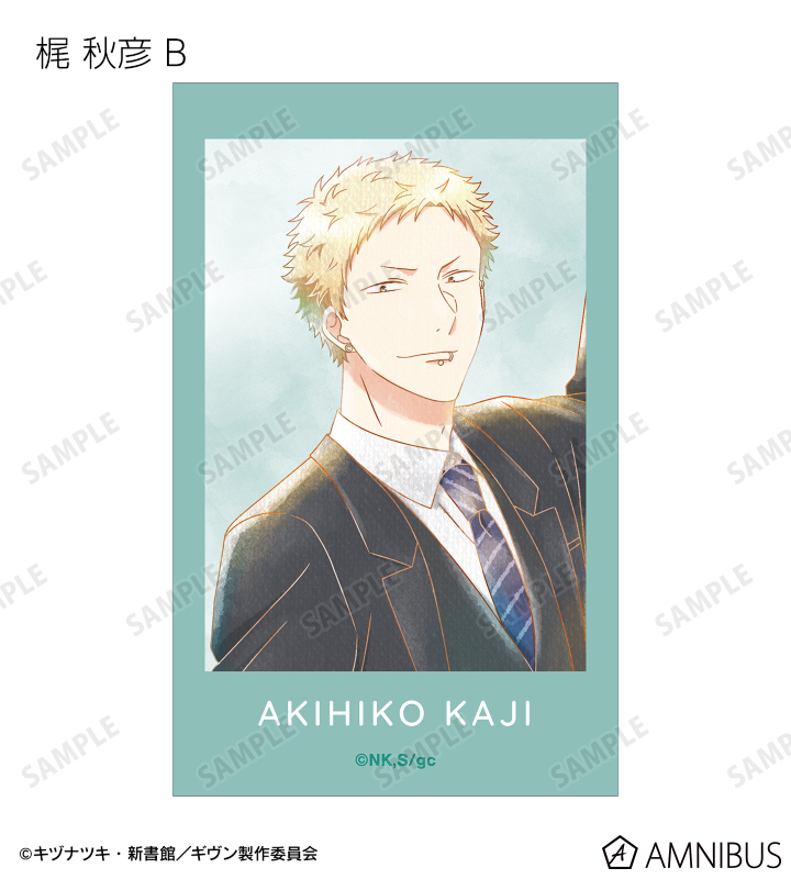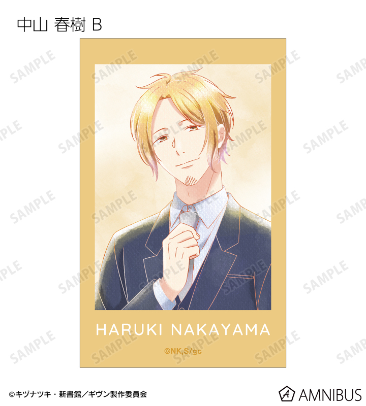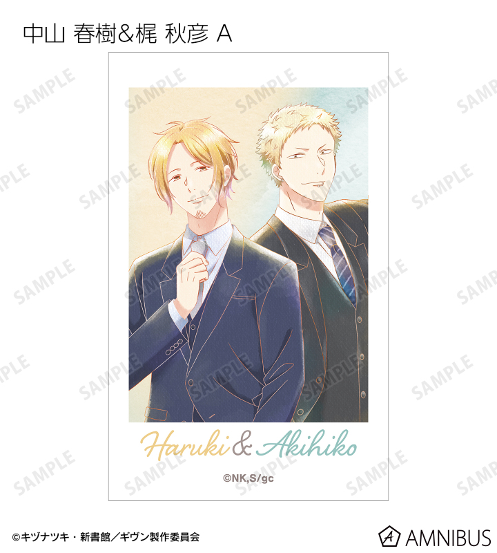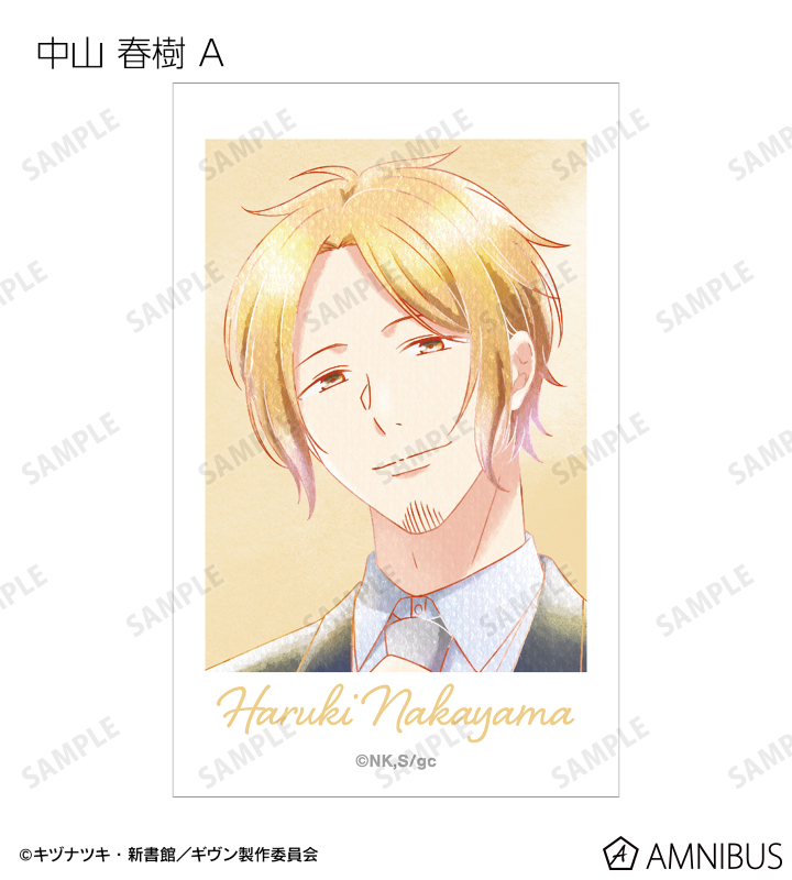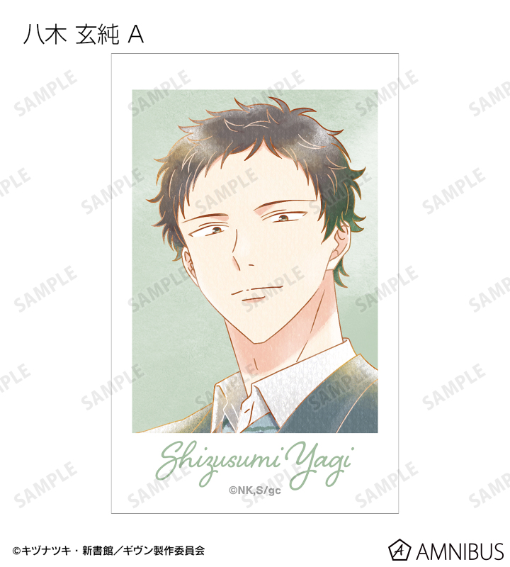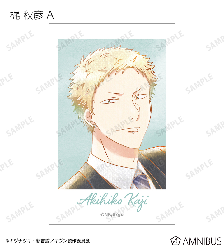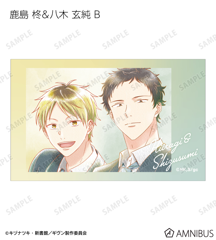 佐藤 真冬、上ノ山 立夏、中山 春樹、梶 秋彦、鹿島 柊、八木 玄純、村田 雨月のイラストを新たなタッチで魅力的に表現し、水彩風デザインのインスタントカメラ風のイラストカード2枚セットに仕上げました。