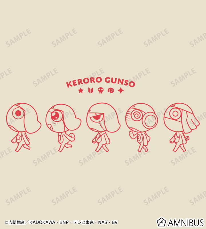ケロロ、タママ、ギロロ、クルル、ドロロが歩いているちびキャラを新たに描き起こし、ランチトートバッグに仕上げました。