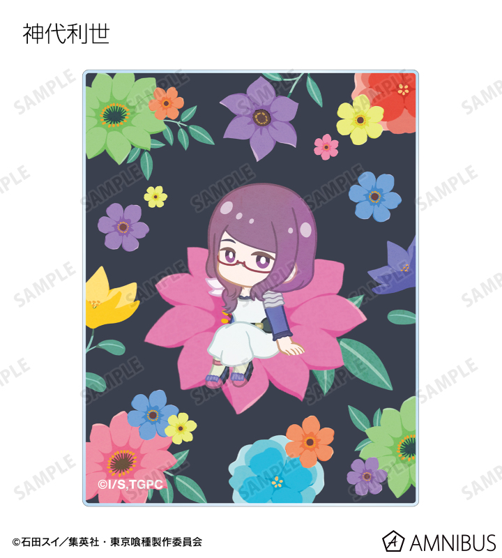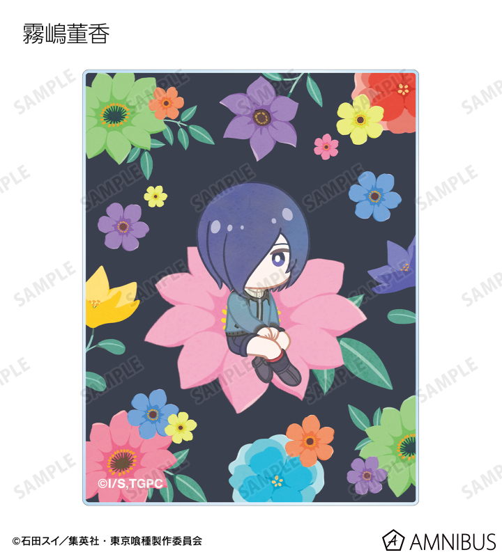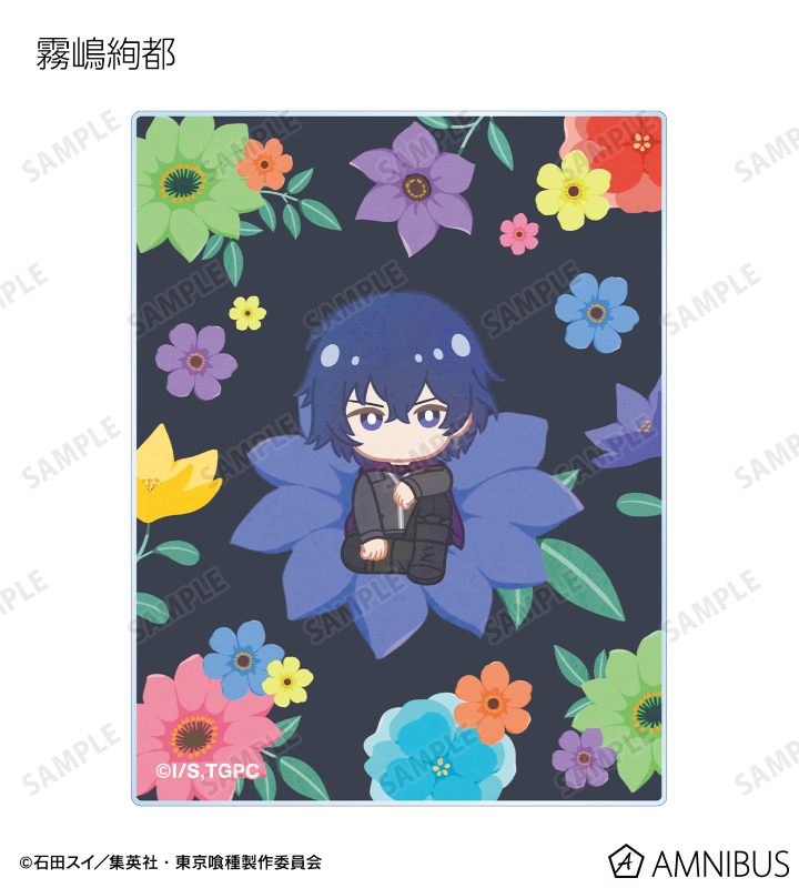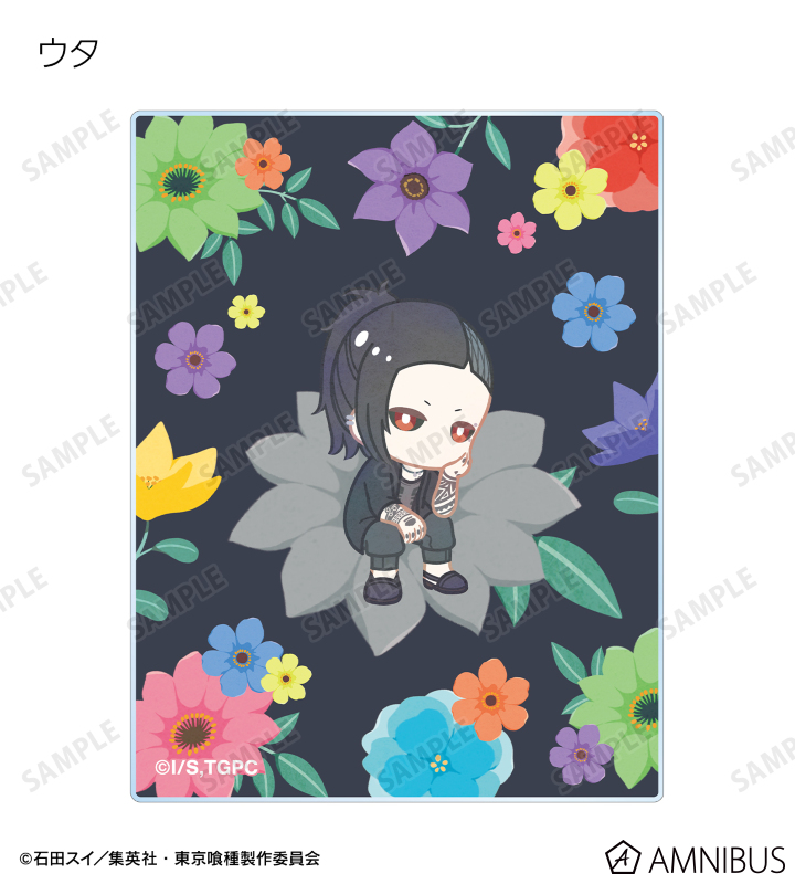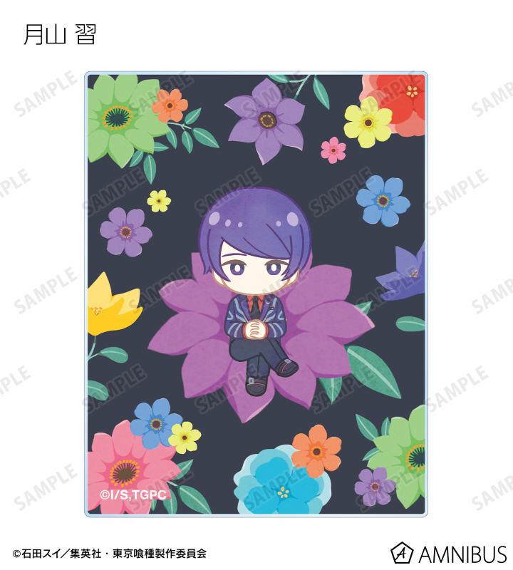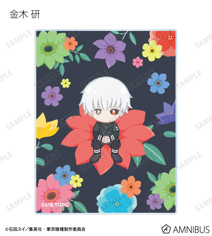 金木 研、霧嶋董香、神代利世、月山 習、ウタ、霧嶋絢都、亜門鋼太朗、鈴屋什造のイラストをボタニカルデザインに落とし込んで繊細なタッチで新たに描き起こし、アクリルカードに仕上げました。