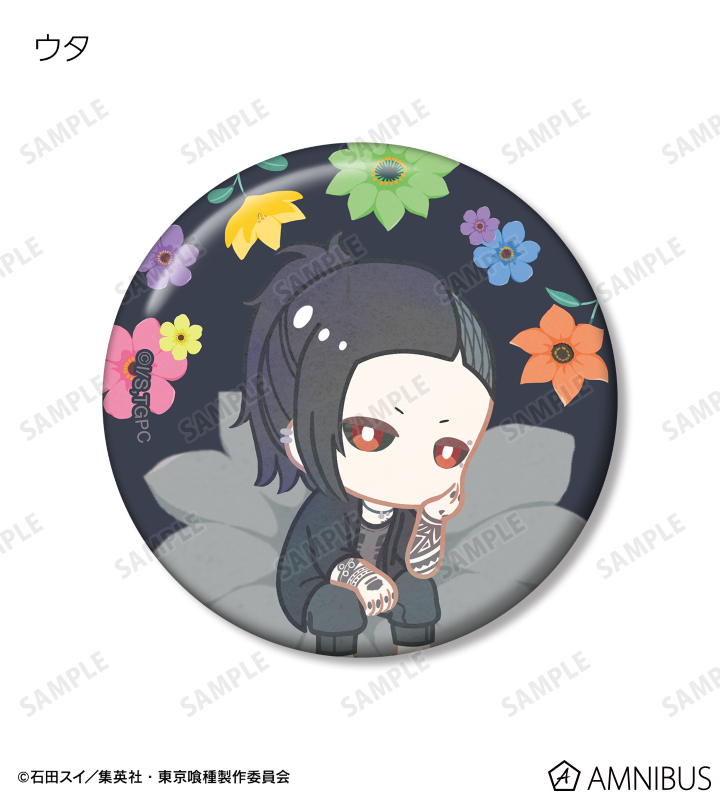 金木 研、霧嶋董香、神代利世、月山 習、ウタ、霧嶋絢都、亜門鋼太朗、鈴屋什造のイラストをボタニカルデザインに落とし込んで繊細なタッチで新たに描き起こし、缶バッジに仕上げました。