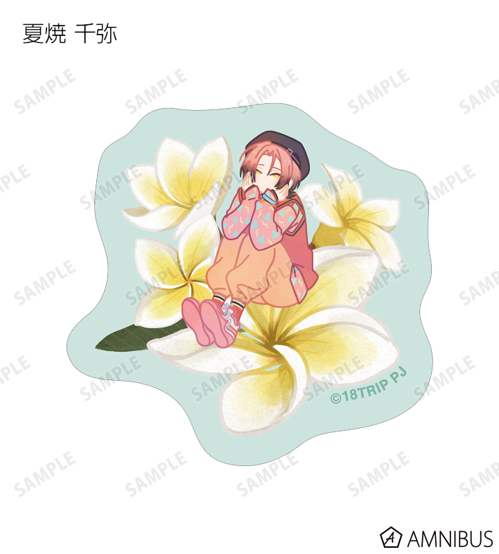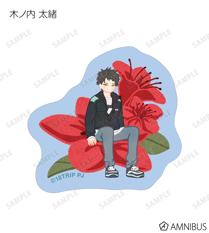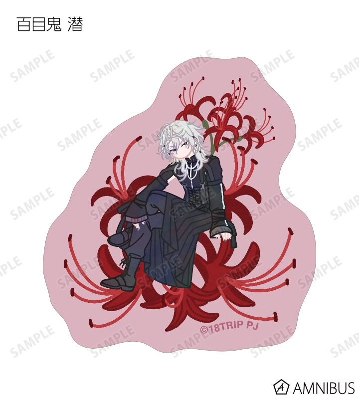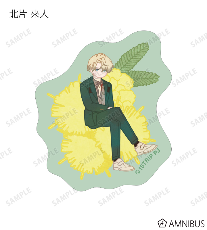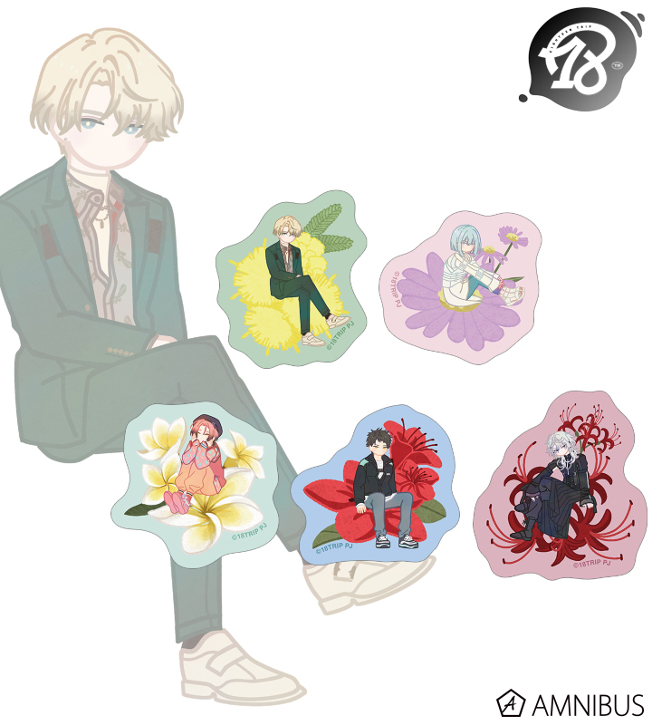 北片 來人、畔川 幾成、夏焼 千弥、木ノ内 太緒、百目鬼 潜のイラストをボタニカルデザインに落とし込んで繊細なタッチで新たに描き起こし、フレークシールに仕上げました。