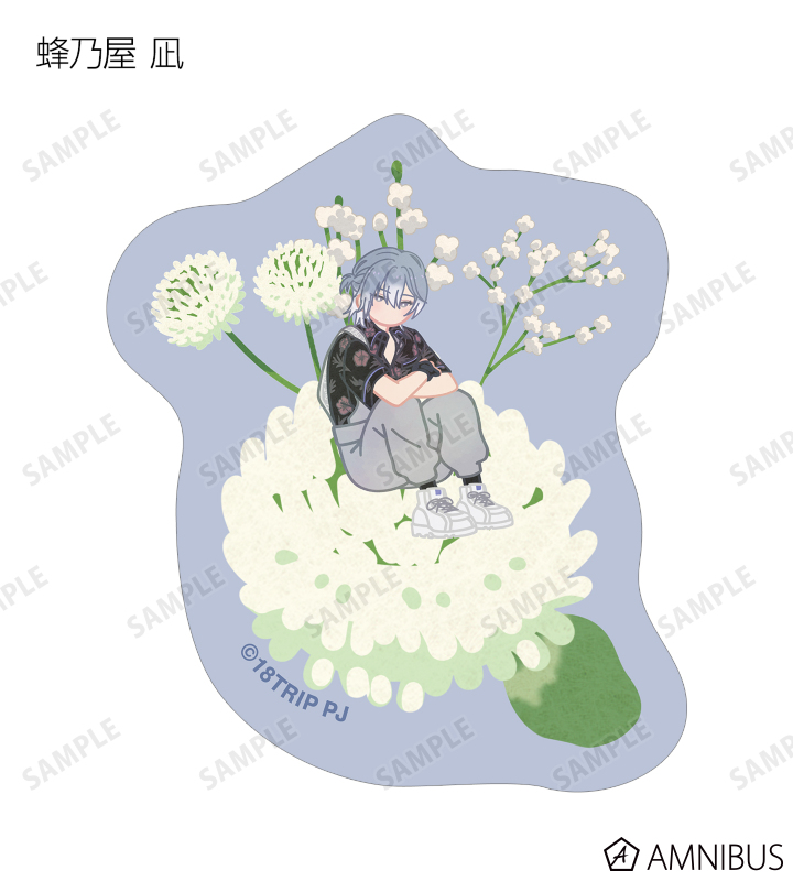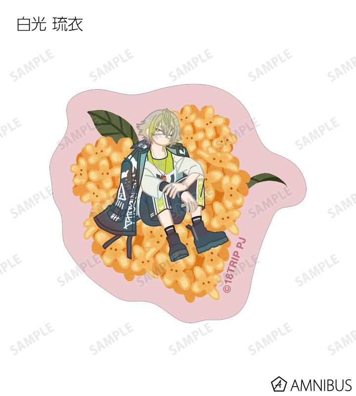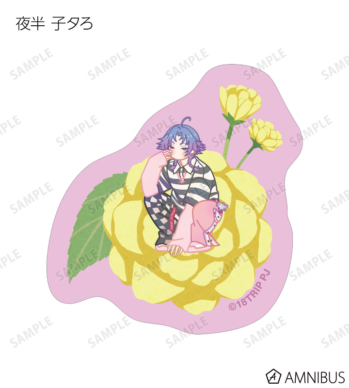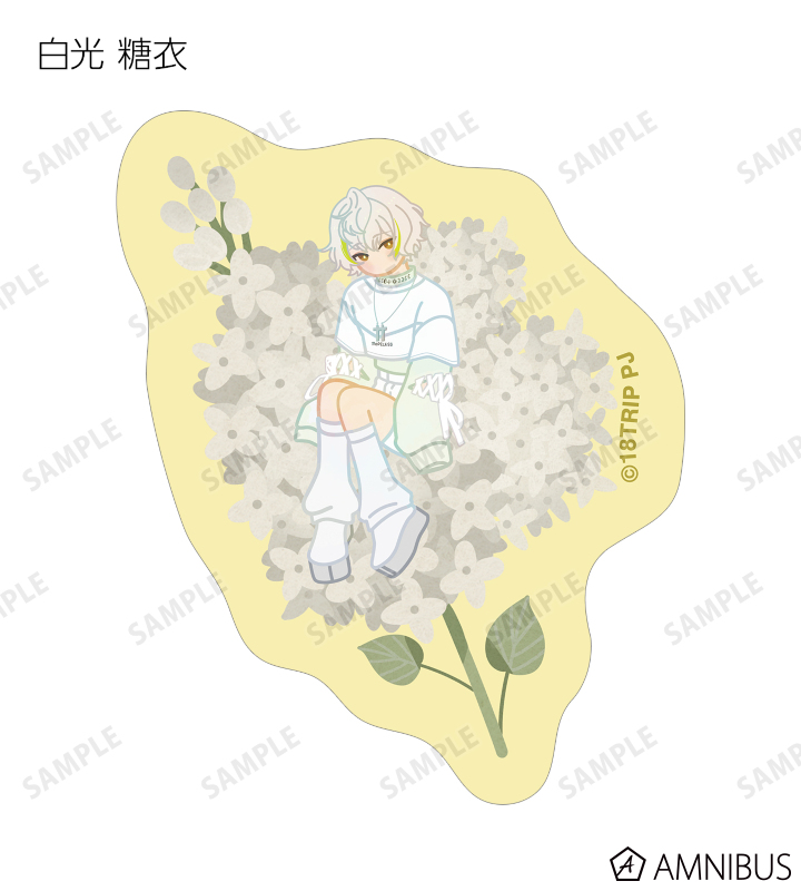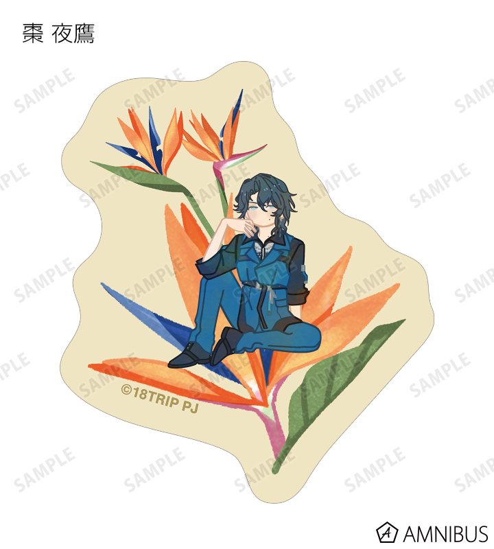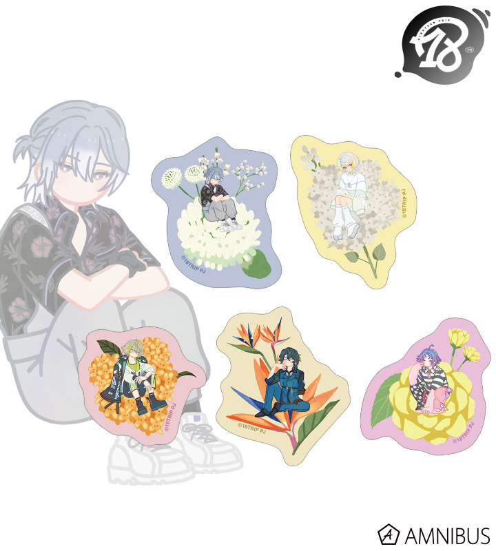 蜂乃屋 凪、白光 糖衣、白光 琉衣、棗 夜鷹、夜半 子タろのイラストをボタニカルデザインに落とし込んで繊細なタッチで新たに描き起こし、フレークシールに仕上げました。
