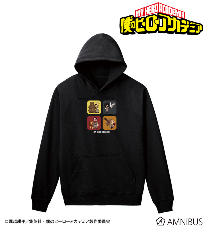 オールマイト、相澤消太、エンデヴァー、ホークスの描き起こしちびキャラビジュアルをメインにデザインし、パーカーに仕上げました。