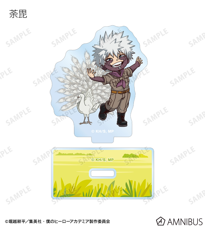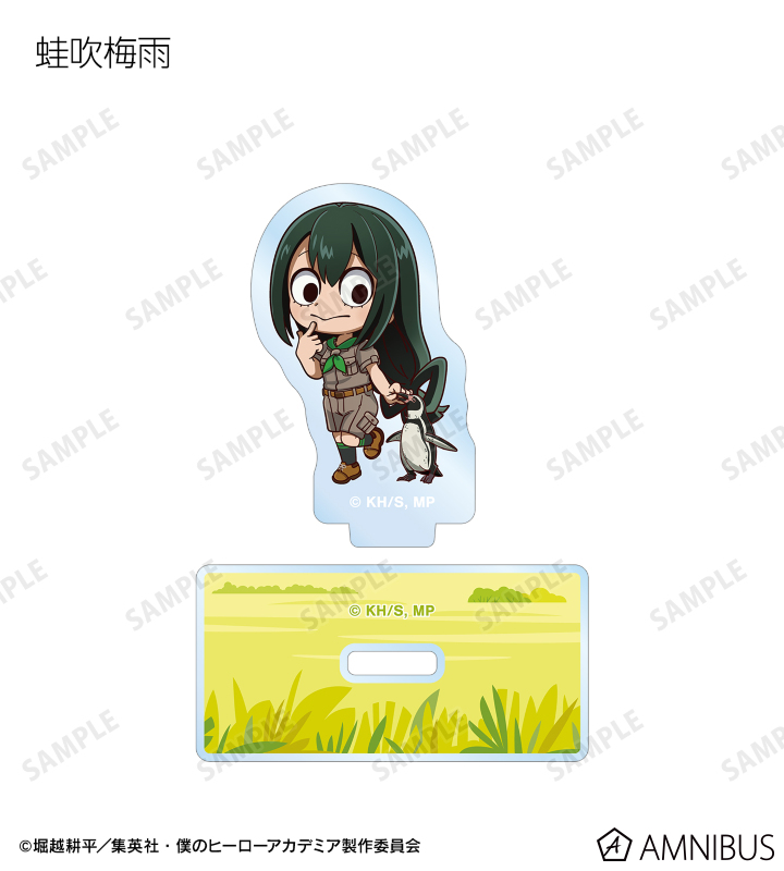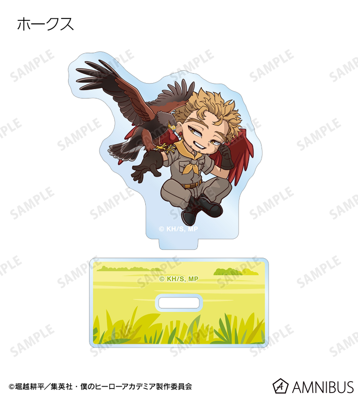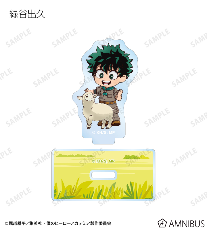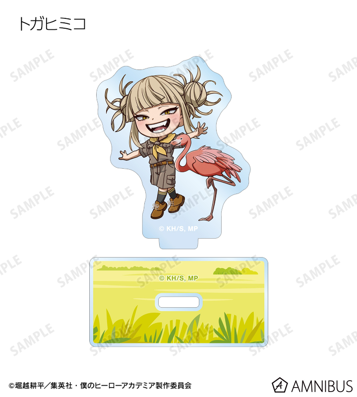緑谷出久、爆豪勝己、麗日お茶子、轟焦凍、蛙吹梅雨、切島鋭児郎、上鳴電気、耳郎響香、心操人使、オールマイト、相澤消太、エンデヴァー、ホークス、死柄木弔、荼毘、トガヒミコの描き起こしちびキャラビジュアルをメインにデザインし、アクリルスタンドに仕上げました。