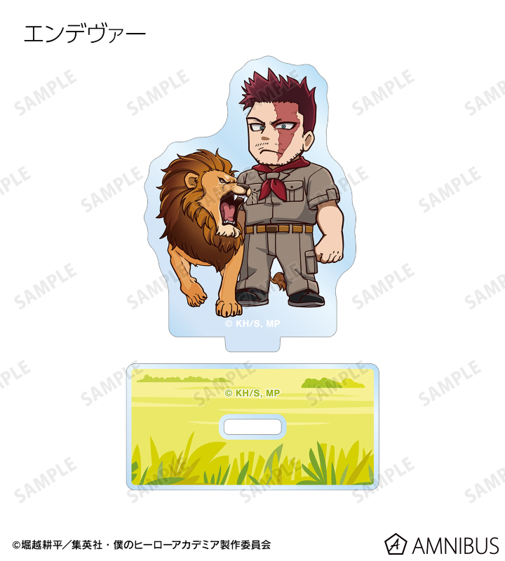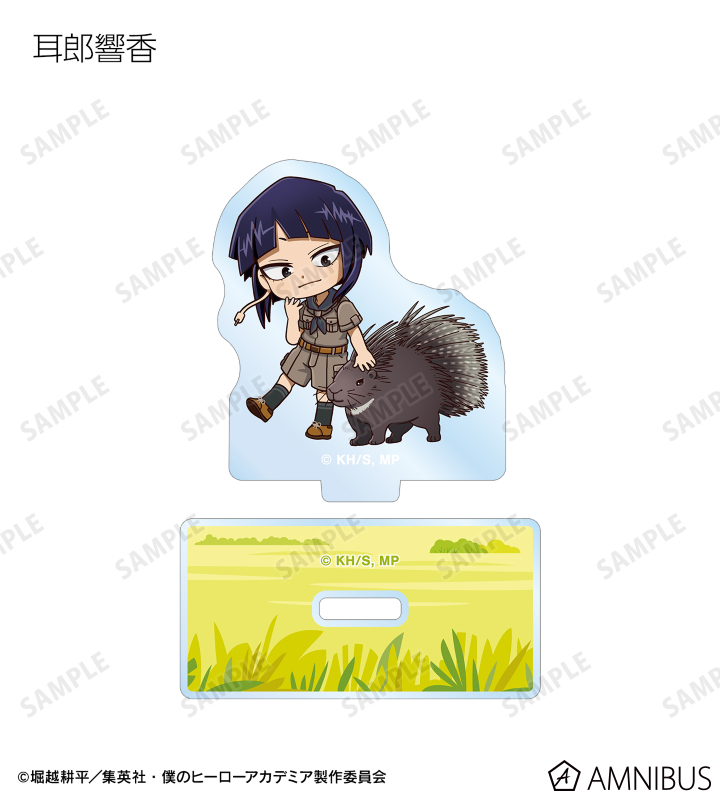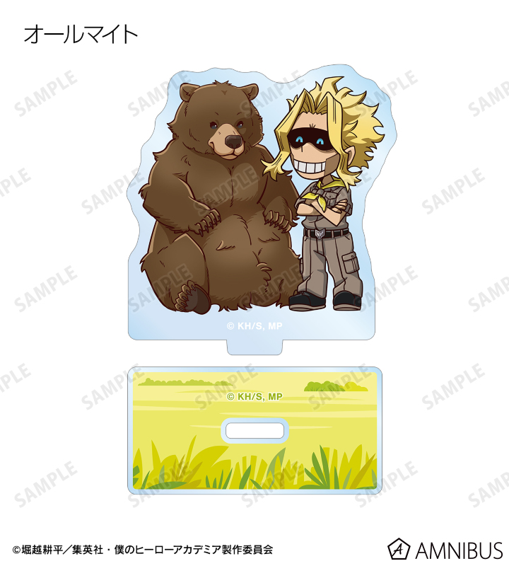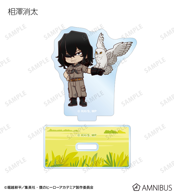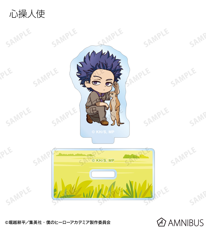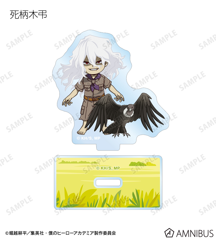 緑谷出久、爆豪勝己、麗日お茶子、轟焦凍、蛙吹梅雨、切島鋭児郎、上鳴電気、耳郎響香、心操人使、オールマイト、相澤消太、エンデヴァー、ホークス、死柄木弔、荼毘、トガヒミコの描き起こしちびキャラビジュアルをメインにデザインし、アクリルスタンドに仕上げました。